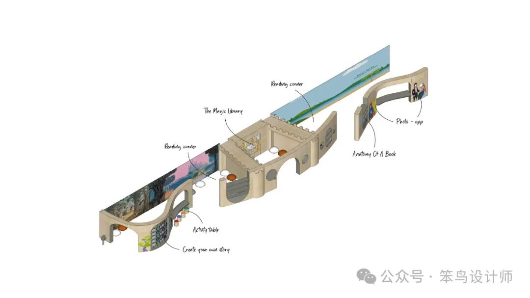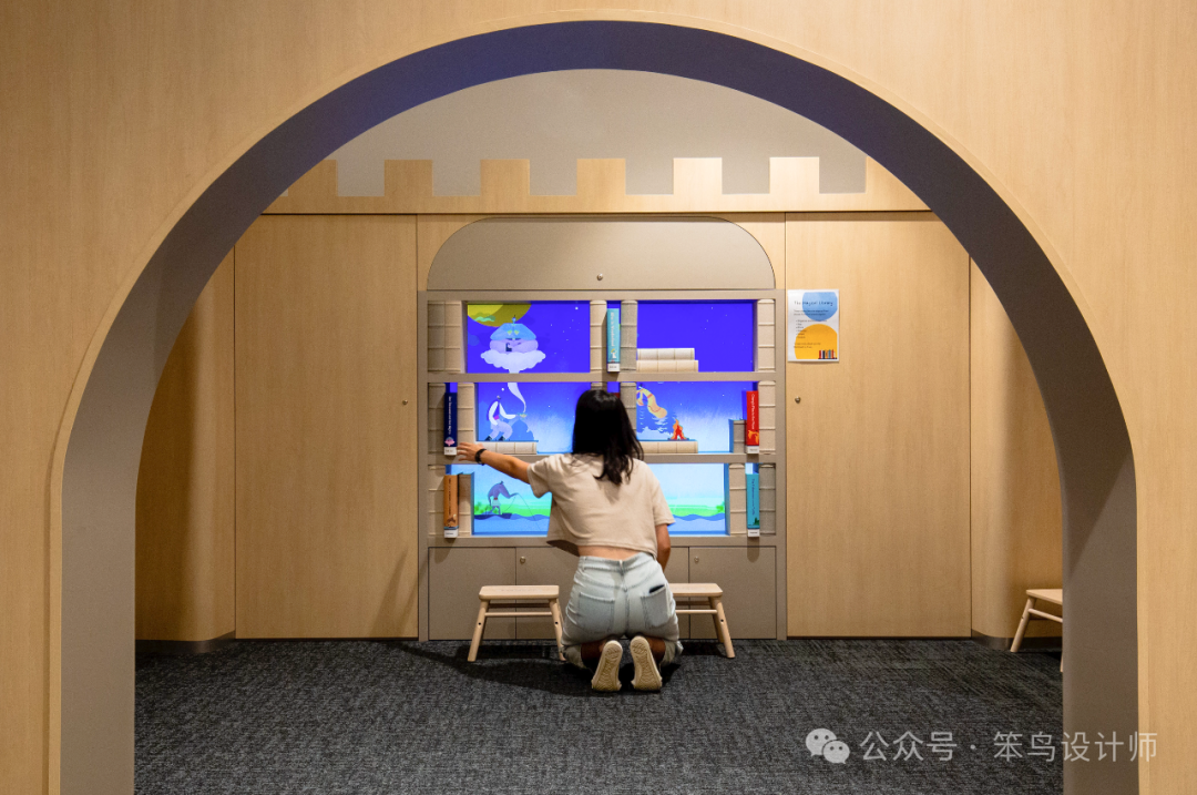 旨在鼓励孩子们创作自己的故事。该空间的灵感来自故事书中的风景,但采用柔和的色调,为所有需要的儿童创造一个包容的环境。海湾中间是魔法图书馆,这是一个实体书架,当拉动书本时,故事书中的人物就会出现。