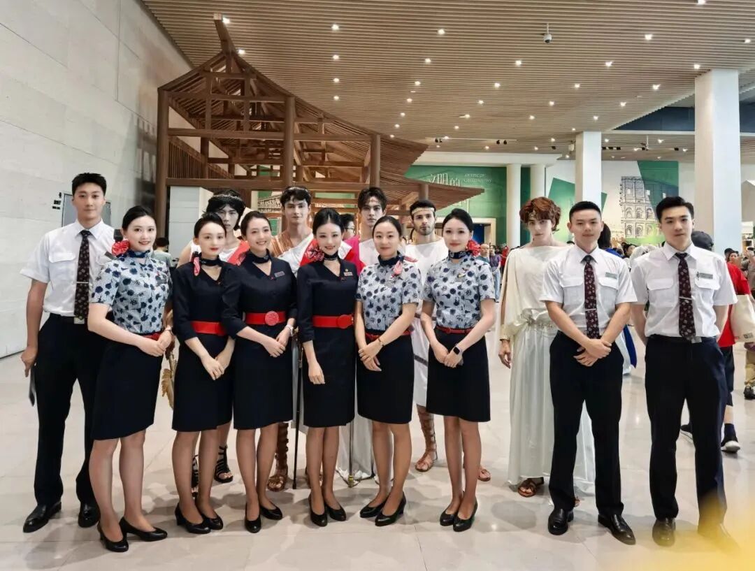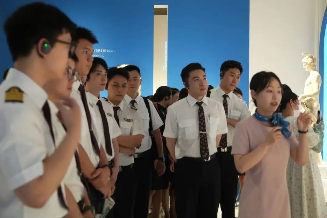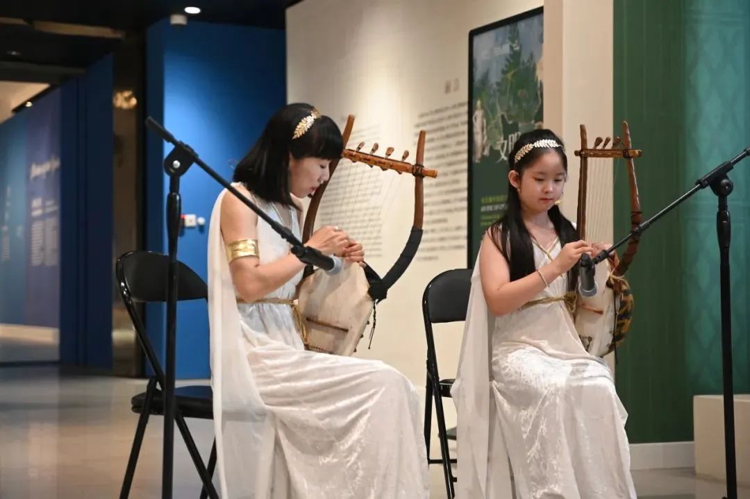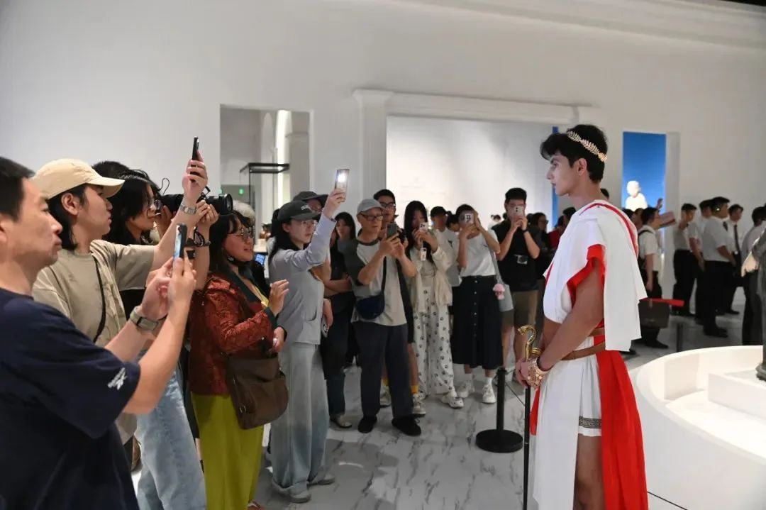 展览开幕当天,成博还举办了一场充满异域风情的快闪活动,当德国作曲家格鲁克《奥菲欧与尤丽狄茜》的咏叹调冲破穹顶,琴弦震颤间,西方最早的拨弦乐器里拉琴流淌出古希腊的浪漫韵律,多位NPC扮演的古希腊诸神阿波罗、雅典娜、阿尔忒弥斯等缓缓入场,带来视觉与听觉的双重体验。现场,既有身着校服的学生们,也有阖家前来的亲子家庭,有来自东方航空的乘务人员,也有来自不同行业的志愿者们……不同年龄、职业的观众们汇聚于此,欢笑声、鼓掌声与悠扬的乐声共同谱写出展览首日的热闹乐章。