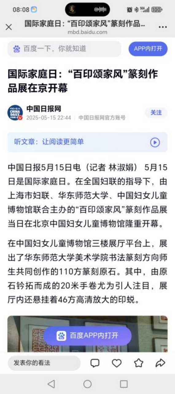 博物馆头条按:2025年5月15日国际家庭日当天,“百印颂家风篆刻作品展”在北京中国妇女儿童博物馆正式开放。展览由上海市妇联、华东师范大学和中国妇女儿童博物馆共同主办,集中展示110枚以传统家庭美德为主题的篆刻作品,涵盖先秦古玺、汉印、瓦当等多种历史风格。