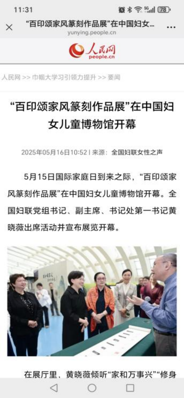 - “家和万事兴”篆刻艺术展亮相中国妇女儿童博物馆:先秦至明清风格荟萃