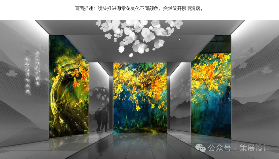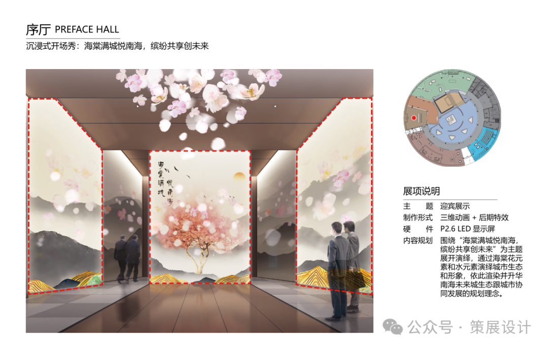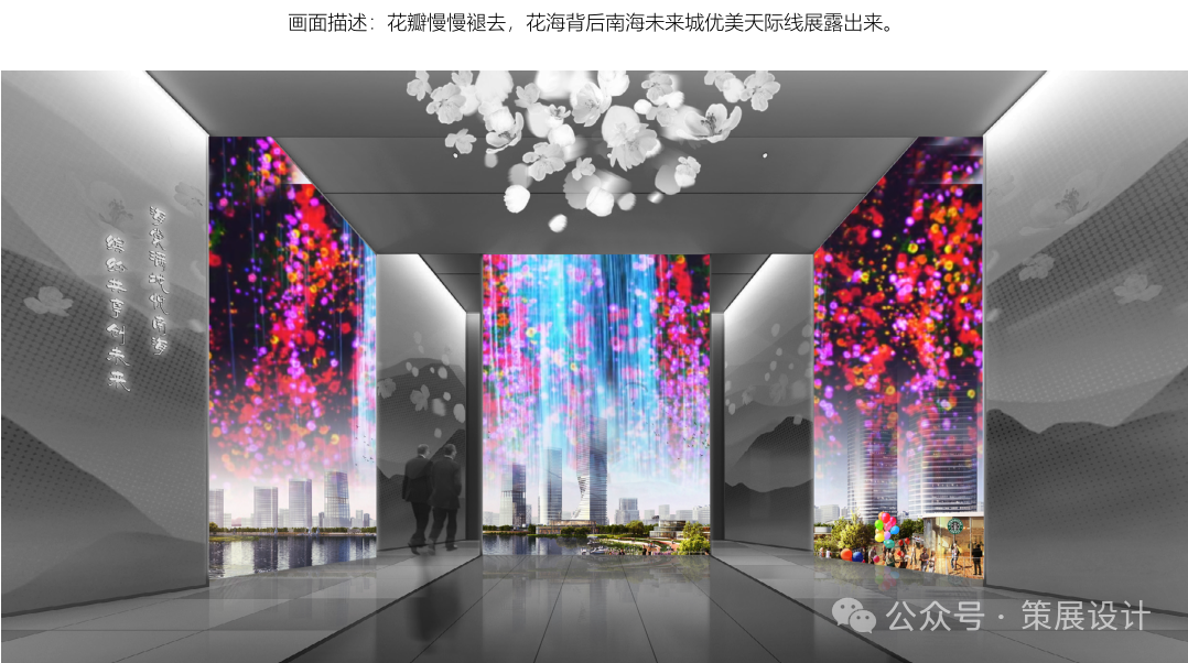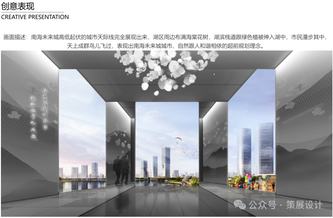 围绕“海棠满城悦南海,缤纷共享创未来”为主题展开演绎,通过海棠花元素和水元素演绎城市生态和形象,依此渲染并升华南海未来城生态跟城市协同发展的规划理念。
