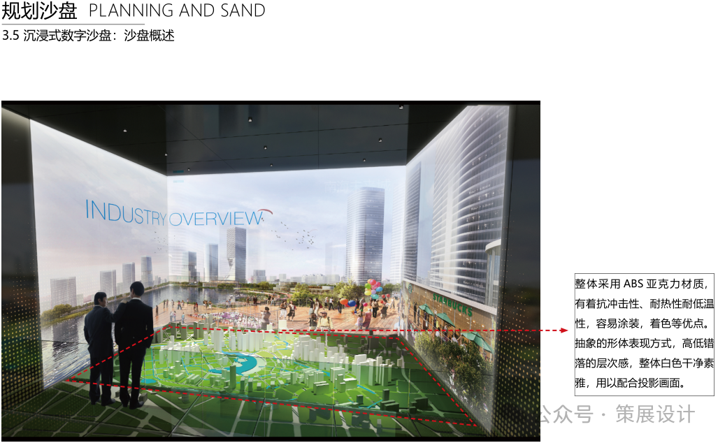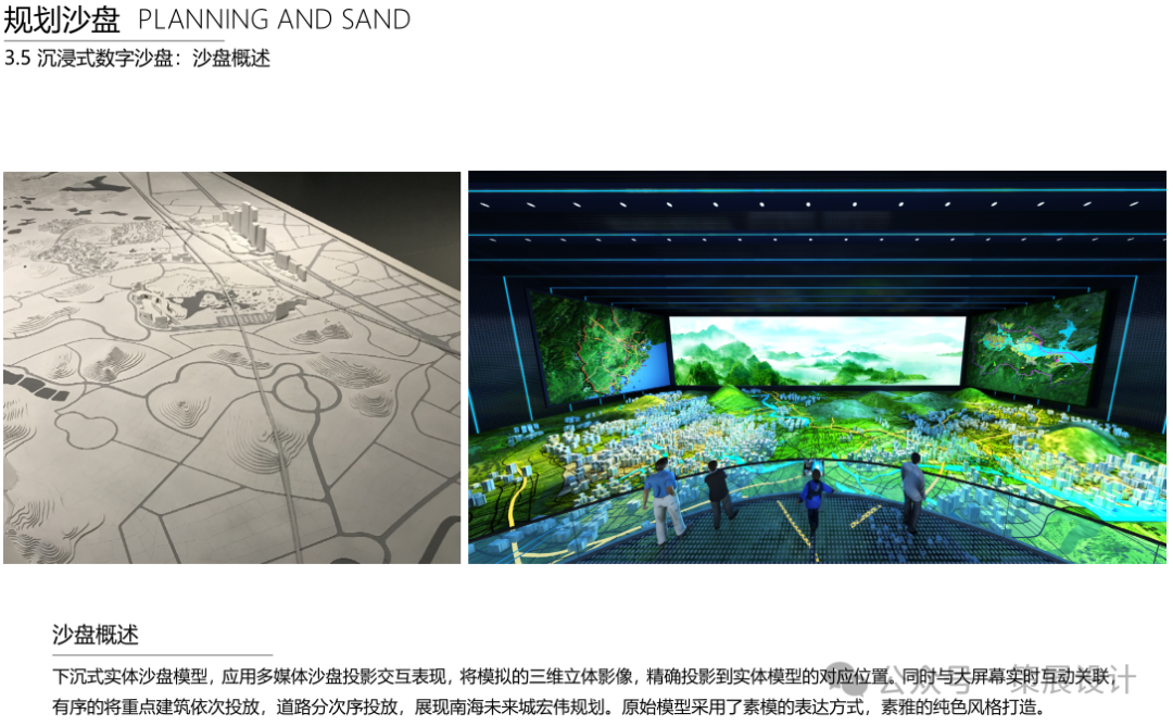 下沉式实体沙盘模型,应用多媒体沙盘投影交互表现,将模拟的三维立体影像,精确投影到实体模型的对应位置。同时与大屏幕实时互动关联,有序的将重点建筑依次投放,道路分次序投放,展现南海未来城宏伟规划。原始模型采用了素模的表达方式,素雅的纯色风格打造。