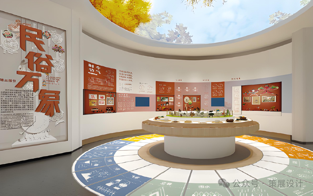 "民俗万象"展区首先带领参观者领略运河沿岸丰富多彩的节庆文化。二十四节气作为中国人特有的时间认知体系,在展览中以创新的方式呈现。一个直径6米的圆形展台上,二十四个透明立柱分别代表一个节气,柱内陈列着相应节气的民俗物品:清明的柳枝和风筝、立夏的彩蛋和秤、冬至的饺子模型和九九消寒图等。当参观者靠近某个立柱时,感应装置会自动播放该节气的民俗讲解和相关诗词吟诵。