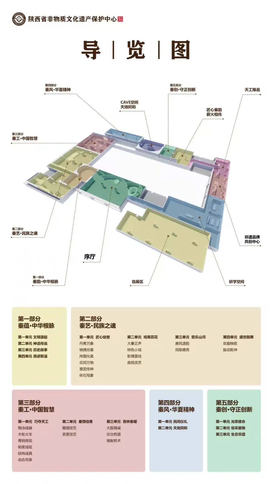 陕西省非遗体验中心是集非遗保护、展示传承、研学体验、创新开发于一体的综合性场馆。展陈内容分为“秦蕴、秦艺、秦工、秦风”四大板块,涵盖非遗十大门类。功能分区包括“秦创区”“生态保护区”“精品区”“文创区”“研学区”“临展区”等,展现陕西非遗保护与创新成果。