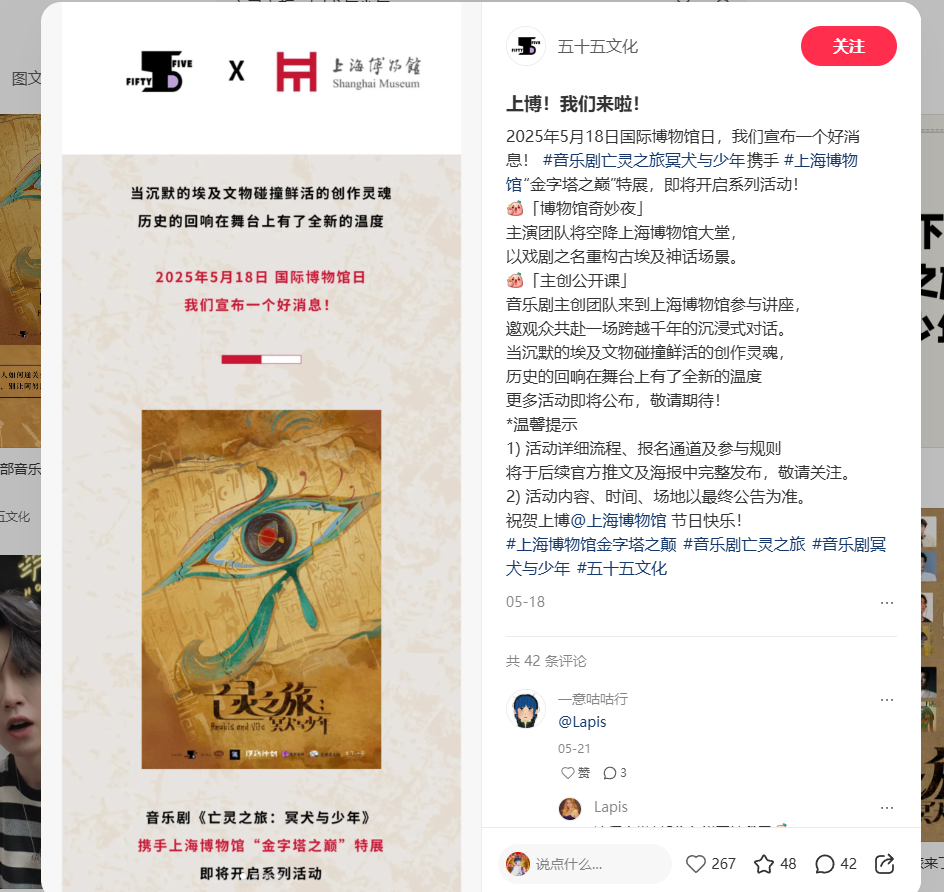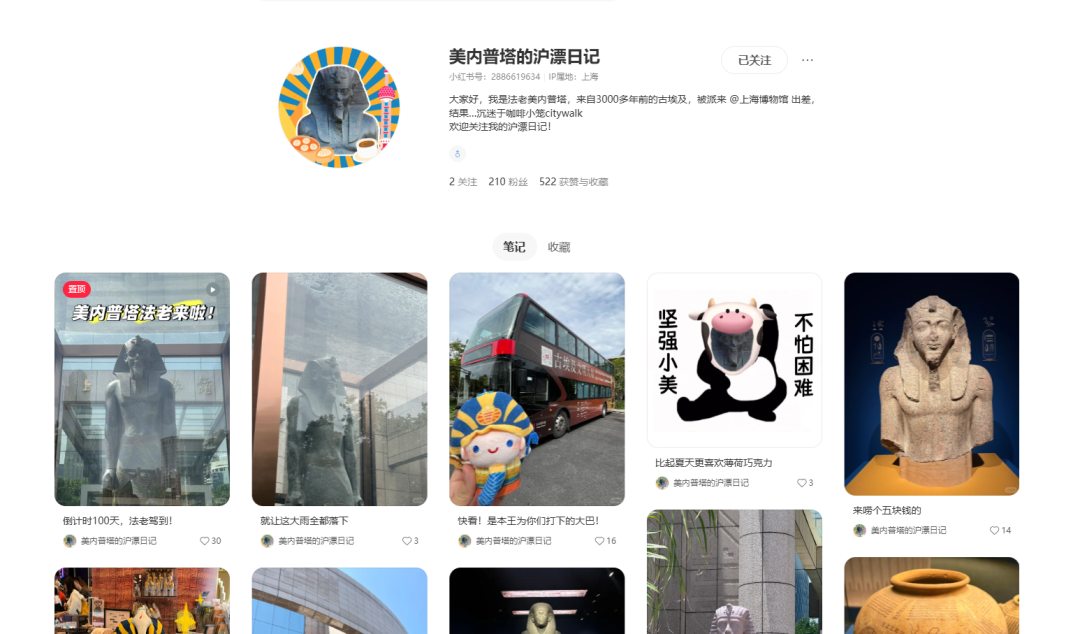 2.新媒体平台互动传播:自5月10日起,古埃及第十九王朝的第四位法老,拉美西斯二世之子美内普塔在小红书平台与海外媒体平台开设专属独立账号,每天同步更新属于自己的“法老日记”,与观众一起聊历史、聊文化、聊热梗。上博官方小红书账号也每周选取展览中的“明星”展品,通过高清图片、趣味文案和短视频等形式发布系列科普笔记,同时发起主题笔记征集等活动,优秀笔记将有机会获得官方平台推介及精美文创礼品。新浪微博@上海博物馆发起“小法老游中国”互动打卡活动,邀请国内博物馆接力发布,号召观众们一起带着“小法老”玩偶回家乡,持续扩大影响力。