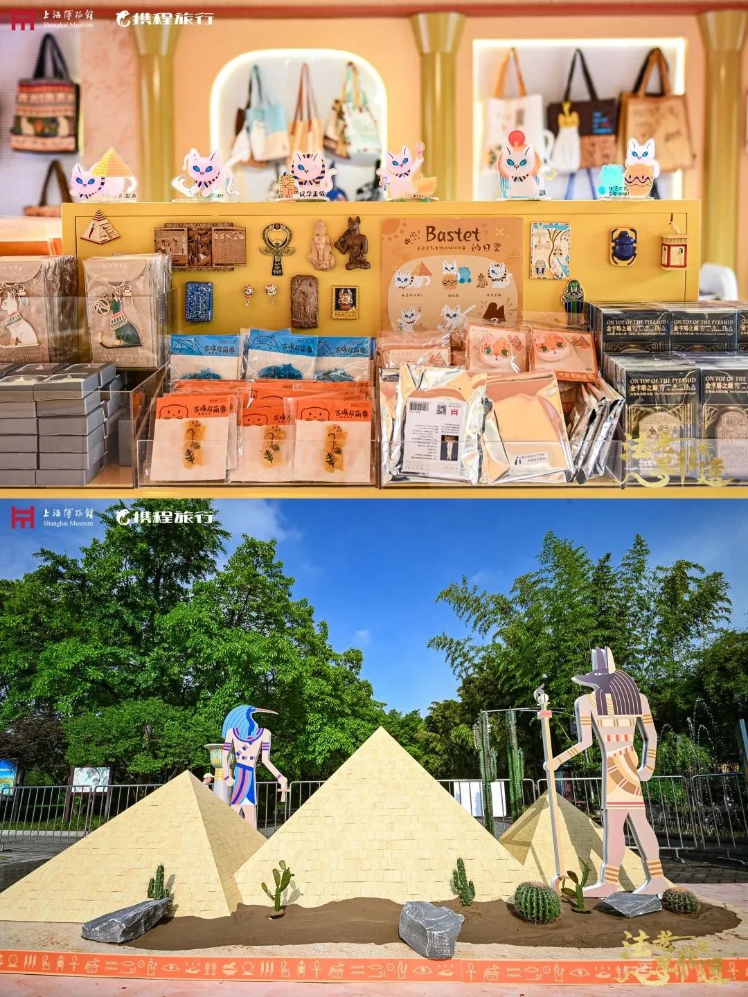 中埃双方工作团队逾800人提前策划、一年多的时间精心布展,上海博物馆给观众带来了更为灵动的观展体验,“沉睡”千年的文物与现代多媒体成功嫁接。例如,“灵猫”叫声植入展厅背景音乐,古埃及传说中“图坦卡蒙踏上永生之旅”形成短片,观众进入环绕式的影像空间,可目睹年轻法老的生命祭典。而模拟从建筑内部眺望外部沙漠的金黄色屏幕前,两尊法老大型雕像正隔空对望。围绕古埃及文明大展,上海博物馆首创“一站式文旅体验新场景”,包括每周六晚举办的博物馆奇“喵”夜,观众可携带宠物猫一同参观展览;“消失的法老”沉浸式体验项目,《埃及猫神庙》移动端小游戏,研学、讲解、教育服务,以及剧本游《萨卡拉的秘密——最后的猫神节》等。此外,上博围绕参展古埃及文物开发了超1000款文创产品,包含“萌神守护”“众神信仰”“神圣符号”“象形密码”和“埃及风光”五大系列,在一众文创产品中,猫神巴斯泰特双层冰箱贴、毛绒玩具法老王“图图”等爆火出圈。