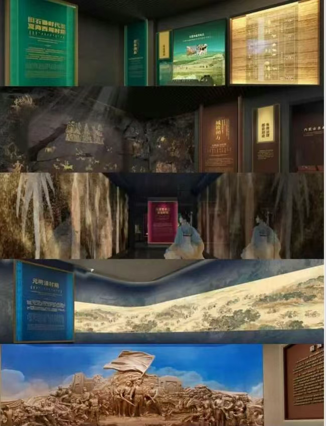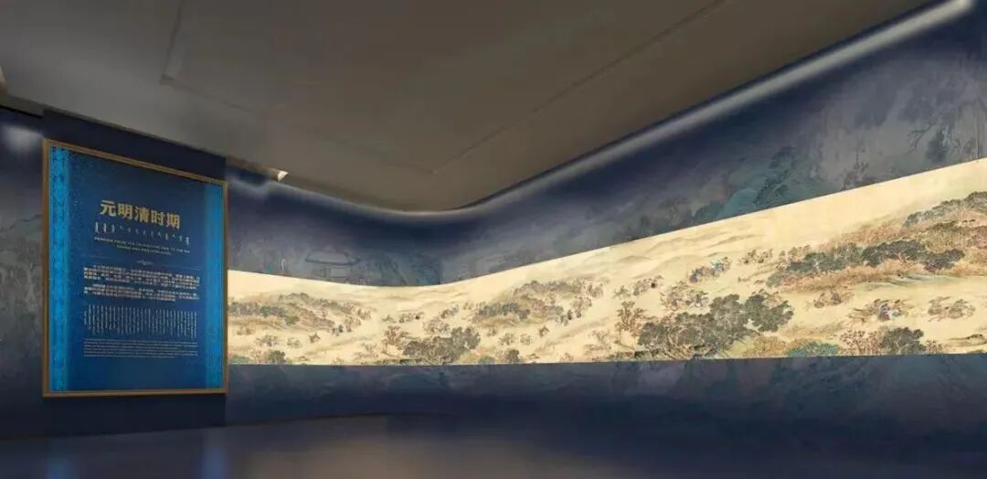“元明清时期”展厅 ,“重建一统”“互动交融”“一体巩固”三大单元层层递进,全景式呈现了元明清时期内蒙古地区各民族共创灿烂文化的壮阔历程。展厅入口处的大型主题投影,以震撼视听重现元代秋猎盛景;沿展线深入,元代金属编织戏台、长城贸易微缩场景等,诉说着内蒙古地区厚重的历史积淀。
