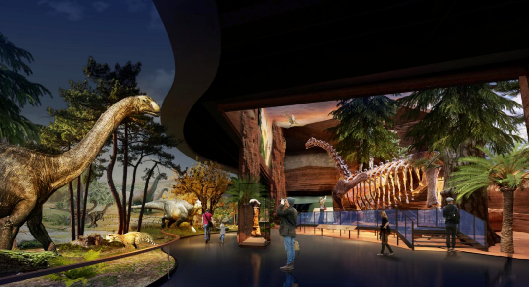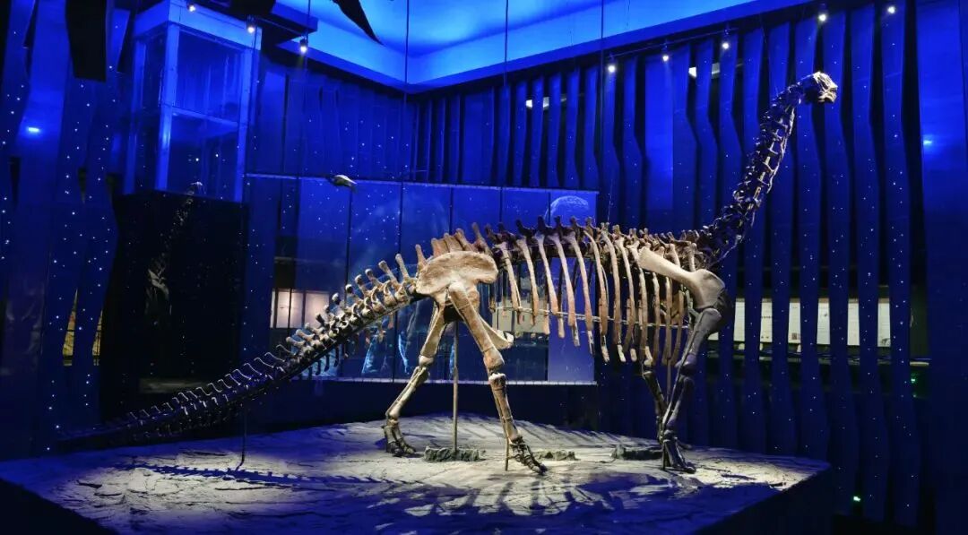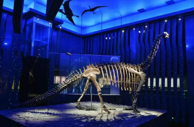 “远古世界”展厅 ,展示了内蒙古地区的远古生物及其生存环境。在这里,你可以看到查干诺尔龙复原骨架、草原猛犸象复原骨架、禽龙类复原骨架等,了解内蒙古地区二十亿年以来远古生物的演化和自然环境的变迁,感受生物与环境相互依存、彼此制约的关系。