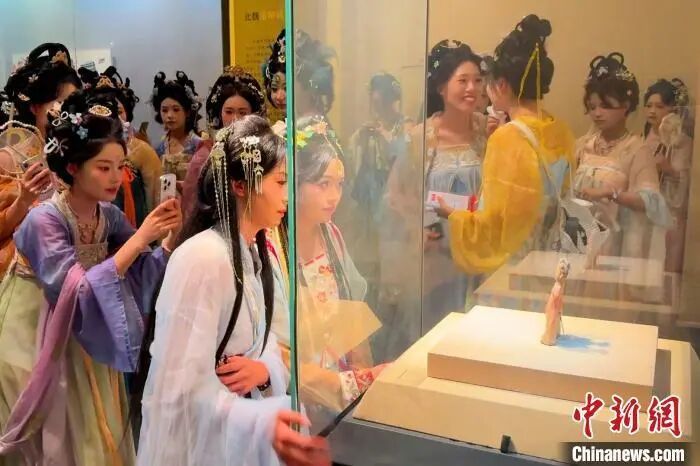 “她们宛若是穿越千年的‘时尚博主’,定格了北魏洛阳街头最动人的风景,更是中华文明绵延不绝、兼容并蓄、生生不息的生动写照。”张林楠介绍,这组女俑亲昵牵手的姿态,引发了人们强烈的情感共鸣。展柜外,时常可见身着汉服的年轻女孩们,模仿着千年前的姿势,牵手合影。
