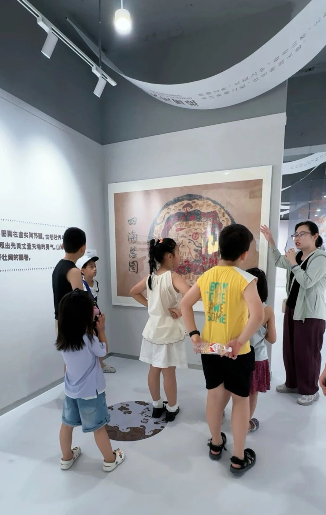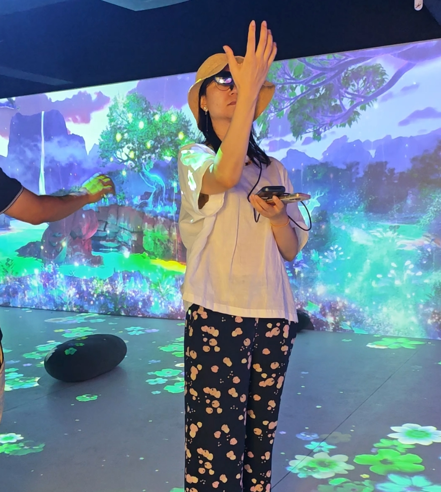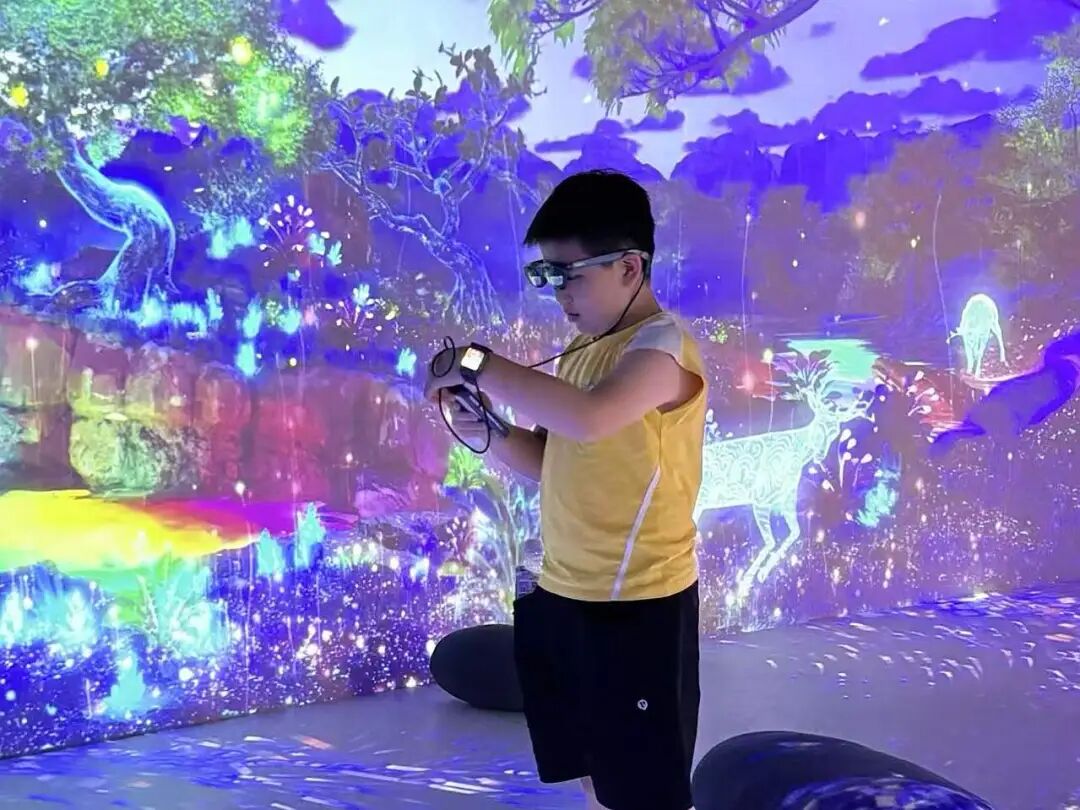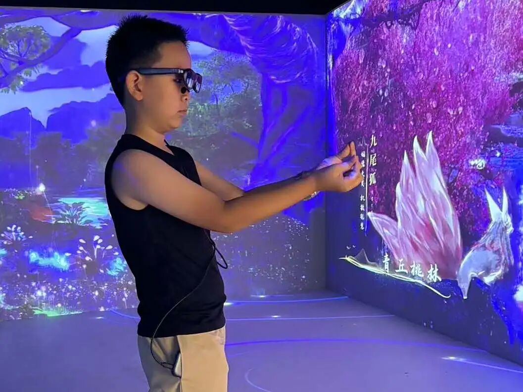 步入二楼的「入卷山海」展区,跟随讲师的指引,解析了《山海经》的天文、地理、神话、物产,科学等诸多方面。整个空间化作流动的叙事场域——家长们俯身与孩子共同探索,时而低声交流神兽的传说。沉浸式CAVE空间,360度环绕投影打造的动态山海经场景,让孩子们在虚实融合的环境中,仿佛真的置身在“昆仑圣地”“青丘桃林”之中。体验AR眼镜环节孩子们真是过足了瘾,体验完看的美景又有互动小游戏,小脸上洋溢着兴奋与满足的笑容,那是对未知世界探索欲望得到满足的最好证明。整个展区充满了欢声笑语,每个人都沉浸在这份由科技与文化交织而成的奇幻之旅中,流连忘返。