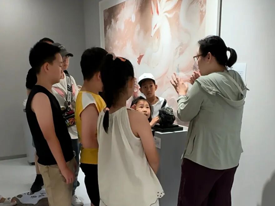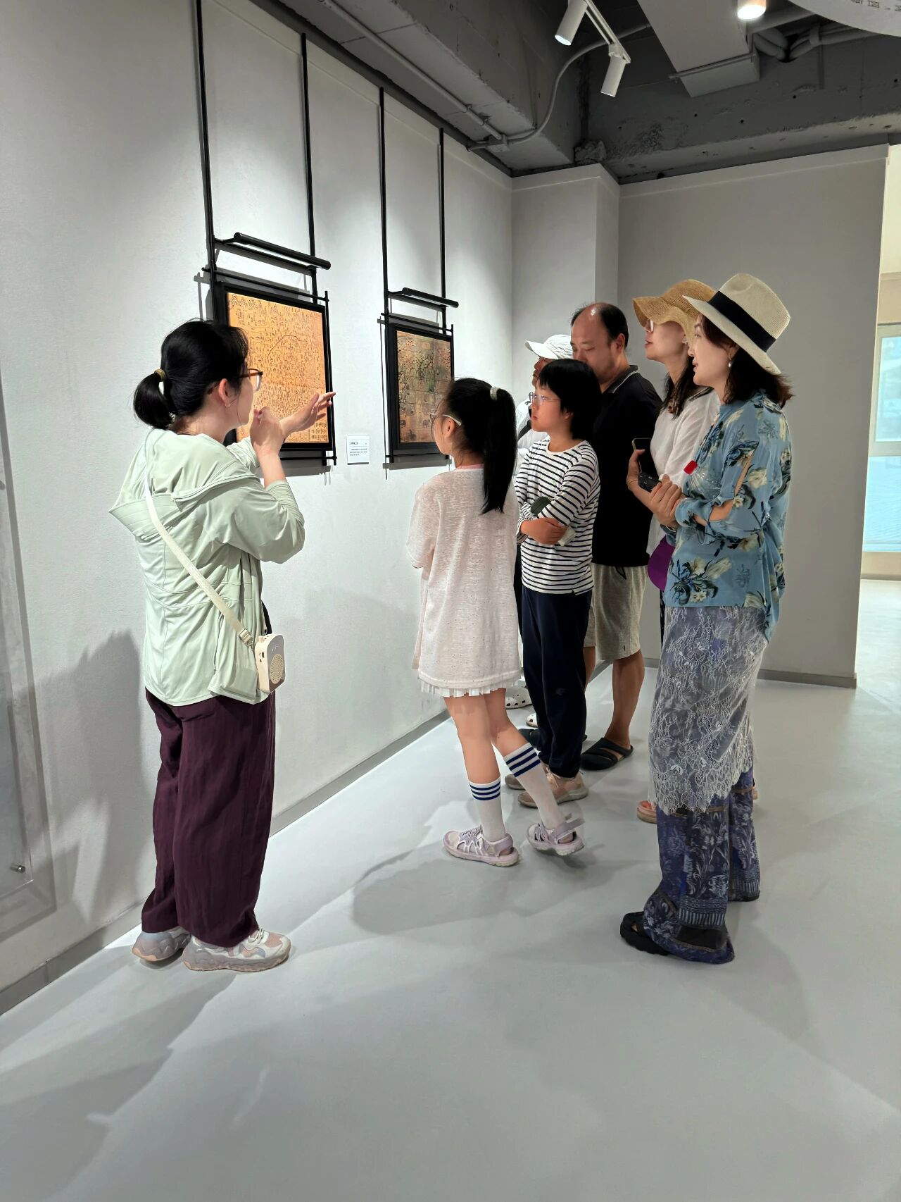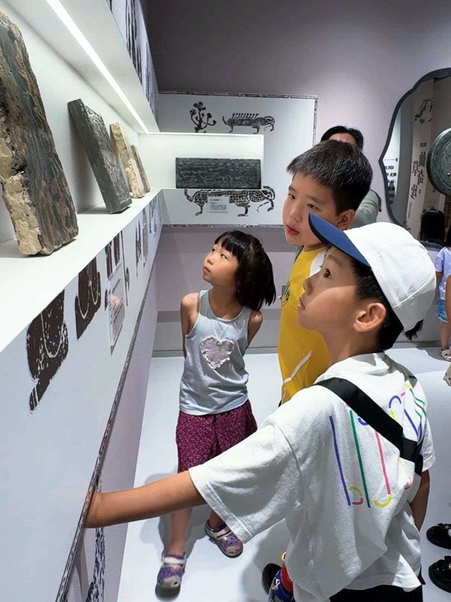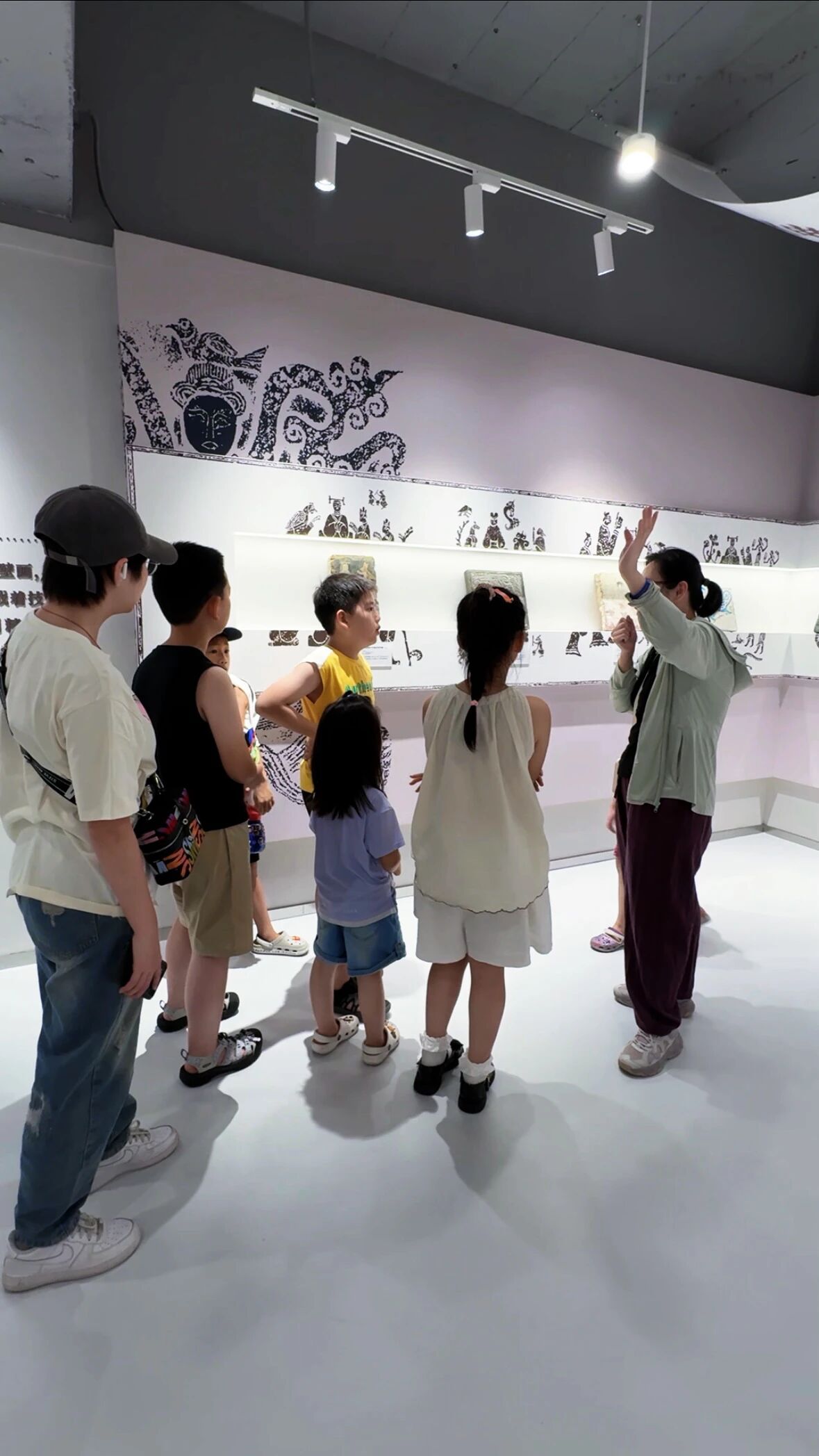 步入二楼的「入卷山海」展区,跟随讲师的指引,解析了《山海经》的天文、地理、神话、物产,科学等诸多方面。整个空间化作流动的叙事场域——家长们俯身与孩子共同探索,时而低声交流神兽的传说。沉浸式CAVE空间,360度环绕投影打造的动态山海经场景,让孩子们在虚实融合的环境中,仿佛真的置身在“昆仑圣地”“青丘桃林”之中。体验AR眼镜环节孩子们真是过足了瘾,体验完看的美景又有互动小游戏,小脸上洋溢着兴奋与满足的笑容,那是对未知世界探索欲望得到满足的最好证明。整个展区充满了欢声笑语,每个人都沉浸在这份由科技与文化交织而成的奇幻之旅中,流连忘返。