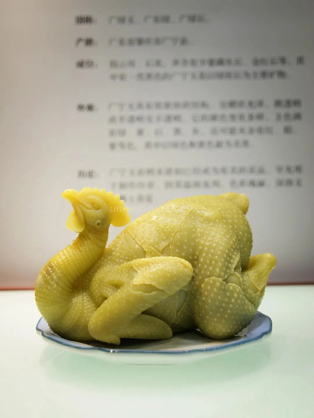 材质意义:广宁玉温润易刻,明末清初即为贡品,常被赋予祈福驱邪的寓意。这件玉雕选用黄色玉料,既还原了白切鸡的色泽,又象征吉祥。