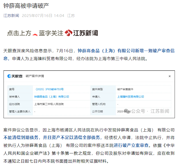 近日,曾因价格高昂被网友戏称为“雪糕刺客”的钟薛高被曝,旗下又一家子公司向相关部门申请破产审查。钟薛高食品(上海)有限公司成立于 2018 年 3 月,近几年,该公司多次被采取限制高消费措施,还被列入失信被执行人名单。钟薛高抖音官方账号最后一次更新也停留在 2024 年 3 月。而市面上,该品牌网红雪糕已难觅踪迹。