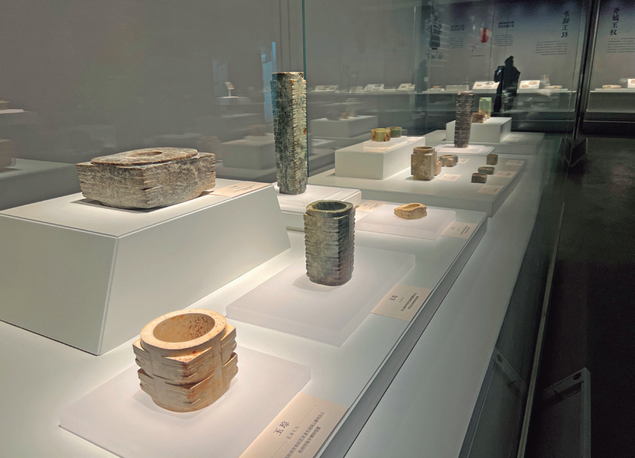 本单元采用文物群组式集中展示和重点展示相结合的方法,共展出了78件(套)玉器文物,其中不乏备受瞩目的“明星文物”,让观众在饱览历代玉器造型之美的同时,深刻感受中华玉礼文化的深厚底蕴。在“恭祀天地”这一章中,一组通柜集中展示了从新石器时代至新莽时期的各具特色的玉璧,另一组通柜则展示了从新石器时代至两周时期,以良渚文化、齐家文化为代表的玉琮形制的演变历程(图3)。此外,展览还特别用独立展柜重点展示了一组来自案板遗址的璧琮套合的特殊展品组合,以最新的学术观点为观众提供了一种新颖的璧琮使用思路。单元结尾处,将陕西历史博物馆收藏的一件史前时期体型最大的端刃类玉器作为压轴,进一步丰富了展览的学术深度和观赏价值。