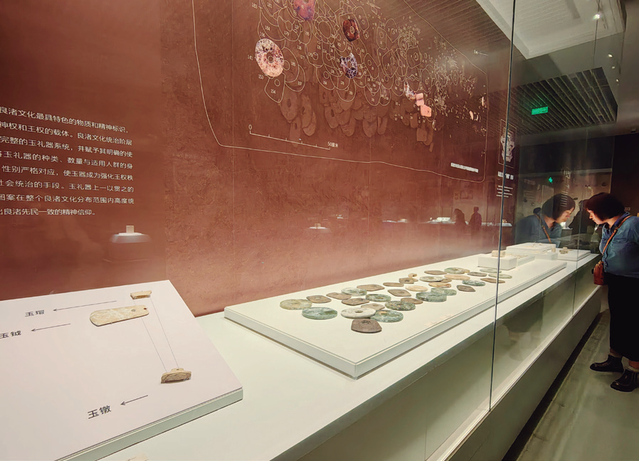 第二单元“区域·文明”,由“辽西圣地——红山”“水乡泽国——良渚”“中土之国——陶寺”“河曲石城——石峁”四章组成。本单元通过横向对比古国时代早期和古国时代晚期两组共4个不同空间的典型文化,分析“玉器在各自文化中对社会复杂化的不同作用,从而认识玉器对文明起源发展模式的不同影响”。为了保持叙事的连贯性和完整性,在每章中首先概述了各个区域文化的文明发展水平,再深入探讨玉器在促进区域文明整合中发挥的独特作用。以“水乡泽国——良渚”为例,这一章分为“聚落繁荣”“权力信仰”两节。“聚落繁荣”一节,通过一组大型展示柜展出了包括农耕工具、动植物遗存、陶器、刻纹陶片在内的30件(组)展品,结合“良渚古城遗址”的多媒体互动展览项目,全方位地展现了良渚文化的农业经济、手工业和文化发展的水平,突显出良渚文化作为区域政治、经济和权力中心的“都城”地位。“权力信仰”一节,通过反山墓地20号墓出土的54件(组)玉器的原物整体集中展示和对良渚重器——玉琮的单独展示(图2),展现良渚文化复杂而精细的玉礼器系统,剖析玉器在强化良渚文化的王权秩序、维系“神王国都”信仰体系中的重要作用。