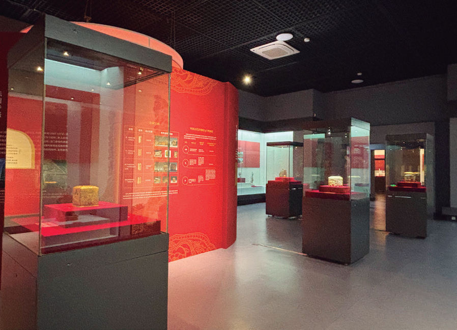 展厅序幕,幕墙喷绘出法门寺地宫的开启场景,昏暗地宫中的鎏金铜浮屠剪影,引导着观众回到发掘现场、回到历史现场(图2)。第一展厅,利用考古发掘现场图、《衣物帐碑》和《大唐咸通启迎岐阳真身志文碑》对重要出土文物作相应介绍,通过遗迹与遗物的对应、文物与展板的对照呈现历史内涵(图3)。第二展厅,以四个重点文物展示柜嵌套成一个小回廊,又以回廊花灯映照着繁复华丽的熏香器,且吟酒诗,且伴舞乐,在嗅、听、味的联想通感中将历史风貌与生活氛围引入高潮(图4)。第三、四展厅,再以重点文物为中心形成回形结构,因版面限制,故将部分版面设计在展柜外(图5)。