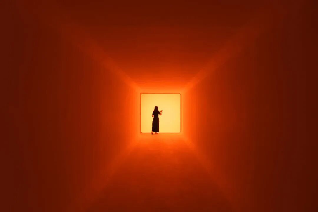 元宇宙既然是人类在虚拟生活的终极状态,我们认为其样貌不会,也不应仅是彰显数位科技的存在,而是有温度和人文感的。因此在展区的起点,我们刻意舍弃科技主题常见的萤光色,使用温暖的橘色长廊打造出抽象空间,隐喻元宇宙的未知和人性的一面。