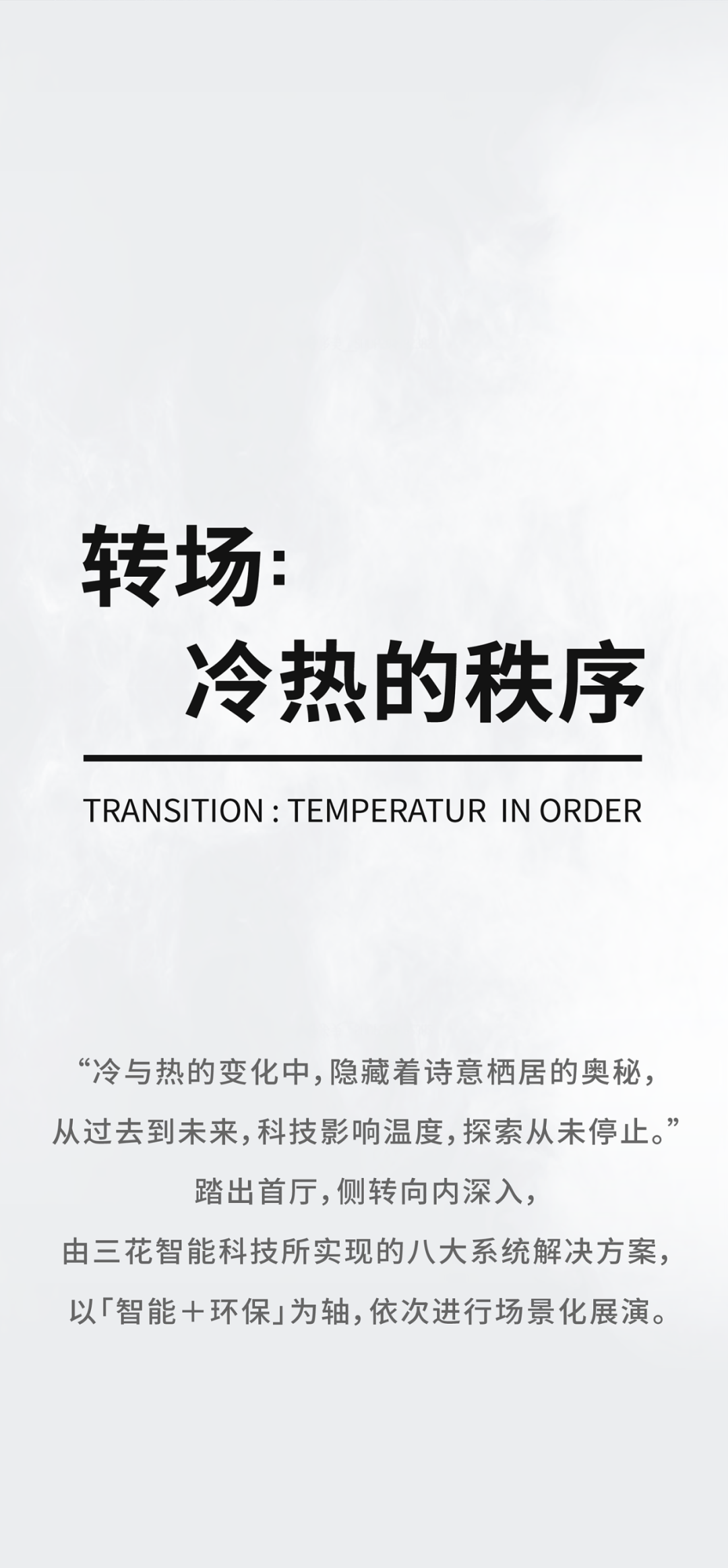 以「温度,无微不智」为理念源点,以现代主义精工美学作为风格导向,高交互性的场景体验,错落植入展厅旅程设定,立体凸显三花制冷产品系统解决方案的全球领先性,结合企业发展脉络、文化理念、荣誉愿景的价值传递,让非专业、专业人群与内部员工,皆能领略由“温度”牵引出的智能科技与环保价值,从而感知「温度的力量」。