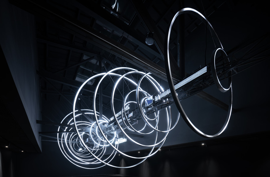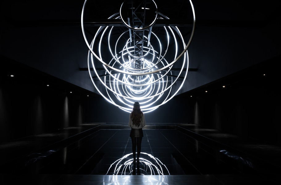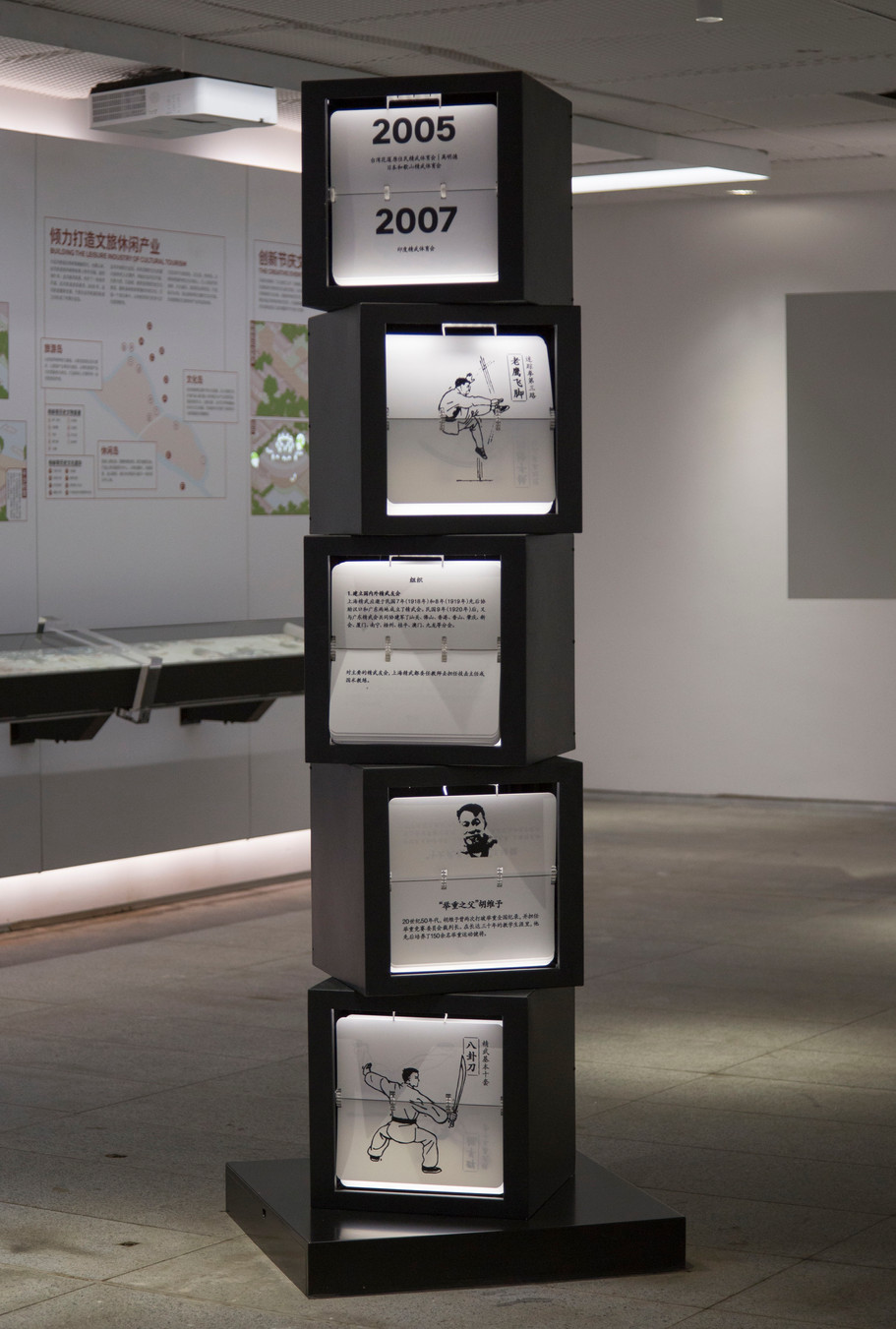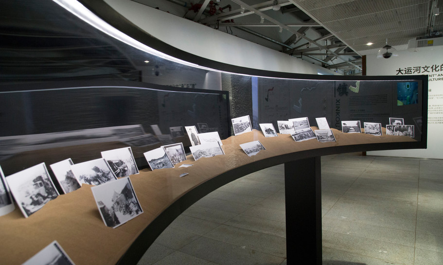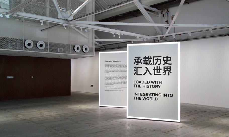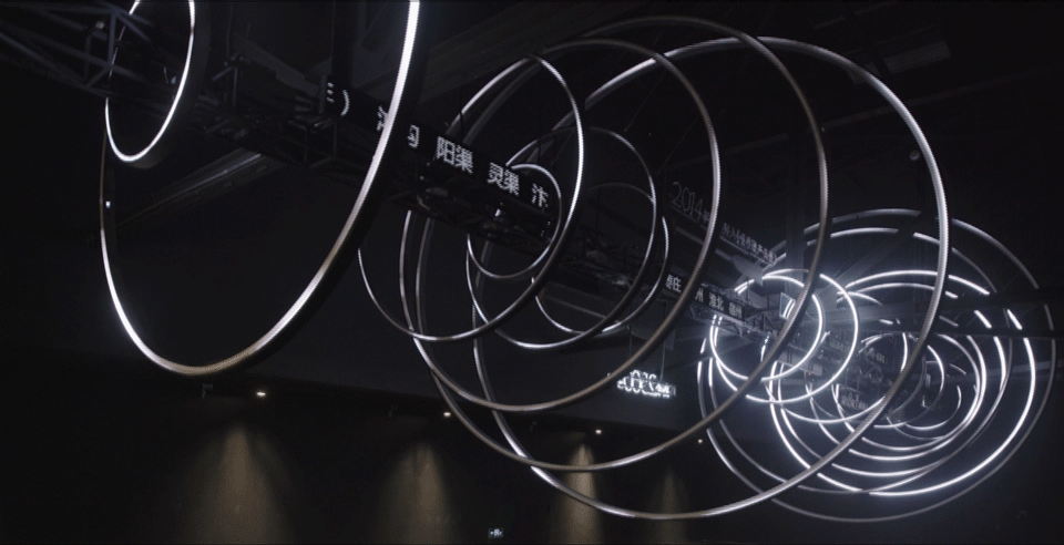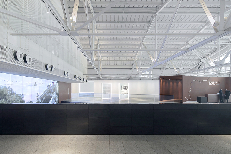 徜徉在两侧白色展厅里,隐隐能够听到节奏感很强的音乐,循声走到展厅最东端的走廊,一座真正的圣殿呈现了:这里悬挂着直径叙事主持设计师李德庚老师和他的艺术家朋友周文斗设计和制作的大型装置,把一部大运河史重新解构和建构,用完全脱俗的方式呈现出历史、现在和未来三位一体下大运河所包含的叙事和意义,以及它在当下的语境下对观众的又一次震撼和启迪。是的,这个运河展厅的空间高潮就叫“行水圣殿”,埋在这栋厂房深处,与室外大台阶所升华的殿宇般的厂房山墙互应互文,让这一栋厂房,变成了一座宫殿。