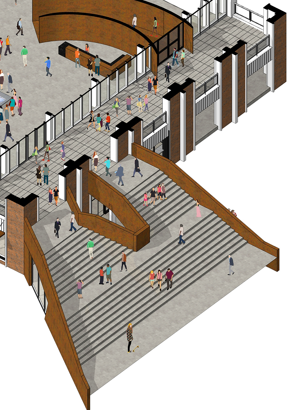 为了不影响后续开发,作为整个园区的启动项目“运河创想中心”,选址在厂区东北角最不起眼的一座厂房,虽然临街,但是位于人流到来方向的最远端,隐蔽在一丛杨树林后面。这个不利的位置反而激发了设计灵感:从厂房生长出一条近两百米长的折形台阶连接入口,它不仅仅隐喻着大运河畔这条搁浅的巨轮重新起航,还因此巧妙地放大了厂房的体量,加强了向它趋近时行走的礼仪感。走到近前,台阶隆起,变成通向二层门廊雄伟的大楼梯,一下子使朴素的、有扶壁立柱的厂房山墙面显得庄重而典雅,有如希腊神庙,宫殿感却呼之欲出。
