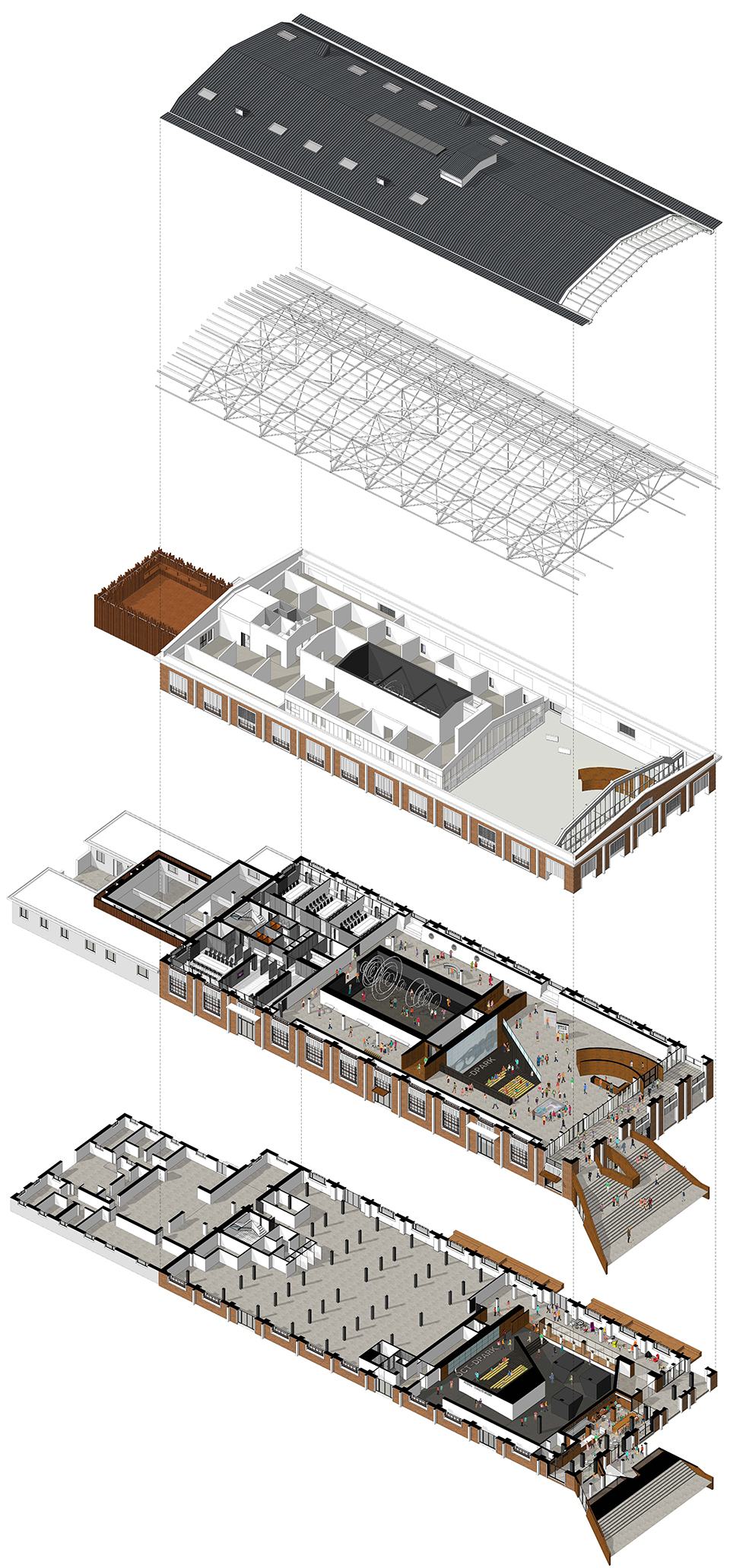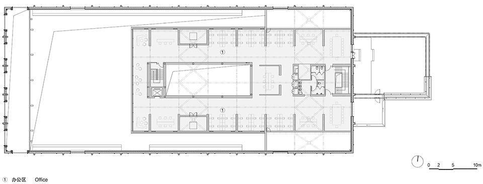 这个原本两千多平米的厂房,要改造成五千多平米的使用空间,除了有作为大型展示的运河创展中心,还有科层制度严格的总部办公及其配套,和接待、会议、咖啡等附属功能,加起来需要变成三层的空间。原建筑的层高也比较有限,屋架下弦距离地面只有7.5米,而要利用屋架空间,则需要另立独立结构。这些条件限制最终推导出一个布局简单、却有丰富的空间层次和逻辑的观览动线的组织架构:平面上把展厅和办公前后一分为二,剖面上则一分为三,把主展厅夹在底层和上层的办公中间,最大化彼此间的互动。这样,将主展厅的地面抬到二层标高后,观众和厂房最有魅力的屋架也接近了。