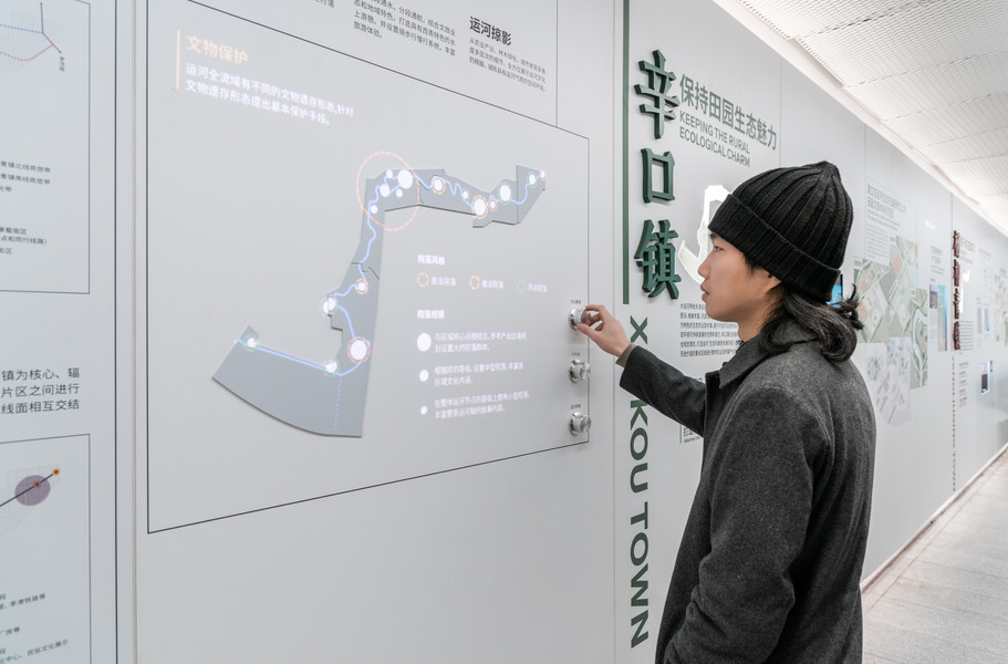 Wandering in the white exhibition halls on both sides, you can faintly hear music with a strong sense of rhythm. Follow the sound to the corridor at the easternmost end of the exhibition hall, and a real sanctuary is presented: here hangs the diameter narrative host designer Li Degeng and his The large-scale installation designed and produced by artist friend Zhou Wendou re-deconstructs and constructs a history of the Grand Canal, and presents the narrative and meaning of the Grand Canal under the trinity of history, present and future in a completely refined way, as well as its current significance. Another shock and inspiration to the audience in the context. Yes, the spatial climax of this canal exhibition hall is called the "Water Temple", which is buried deep in the factory building and interacts with the temple-like gable wall of the factory building sublimated by the large outdoor steps, so that this factory building, turned into a palace.