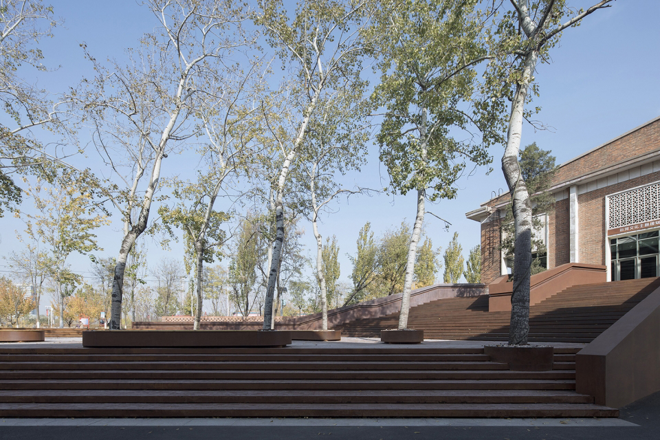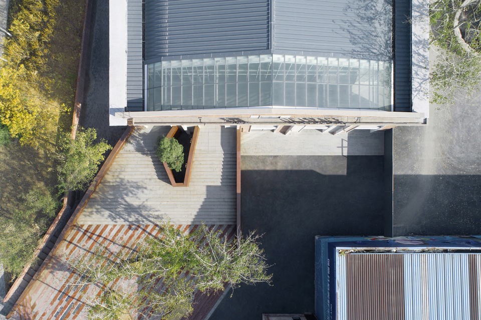 In order not to affect the subsequent development, as the start-up project of the entire park,"Canal Creation Center", the most inconspicuous factory building in the northeast corner of the factory area is located. Behind. This unfavorable position inspired the design inspiration: a nearly 200-meter-long folded step grows from the factory building to connect the entrance, which not only symbolizes the restart of the stranded giant ship on the Grand Canal, but also subtly enlarges the factory building. The volume of the building strengthens the sense of etiquette when walking towards it. As you approach, the steps rise and become a grand staircase leading to the porch on the second floor. Suddenly, the simple gabled wall of the factory building with buttresses and columns looks solemn and elegant, like a Greek temple, but the sense of palace is ready to emerge.