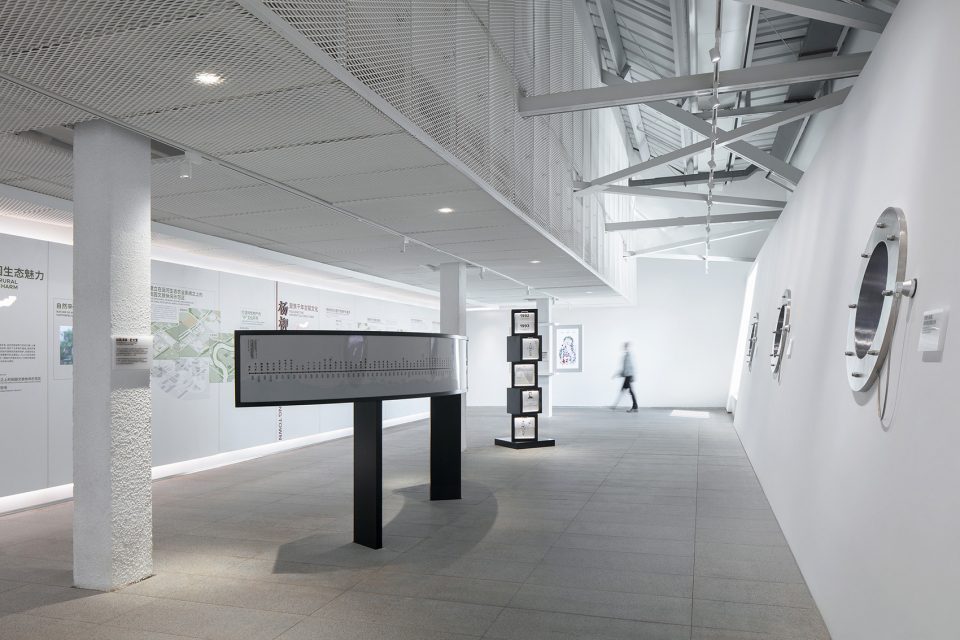 The main exhibition floor is in the layout of the word "Hui", and the long walls on both sides are slightly inclined. The repeated deliberation of this slope in the section has many considerations: let the outer windows of the original factory building remain as they are, and not be layered due to floor division; Provide a narrow and high space for the areas on the ground floor on both sides of the outer wall; separate the exhibition wall of the main exhibition hall from the wall of the original building; of course, the most visually meaningful is to make this 30 meters long With a little tension on the exhibition wall, it shows the strength of a palace wall. The exhibition design of Diameter Narrative is the icing on the cake on this wall. Several circular exhibition windows like portholes of ships are opened, which awakens the theme of the sleeping factory building and sailing again.
