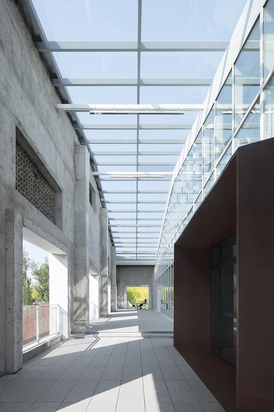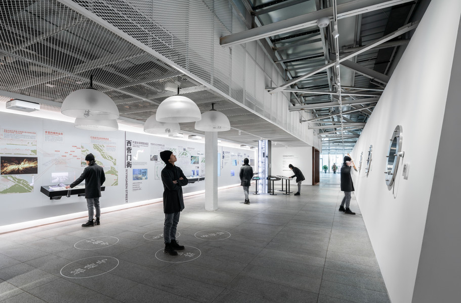走进二层门廊,展厅的主体量被设计为与山墙外皮脱离,在通透的天窗下,用太阳的光影刻画出新旧对比:一面是原原本本的山墙里侧,记忆了各种使用及施工的痕迹,不饰雕琢;一面则是通高的大玻璃墙,透视出里侧需要认真筹划的大展厅。与这个开放的空间相对比,一条弧形锈钢板走道把观众从隧道中引入展厅。