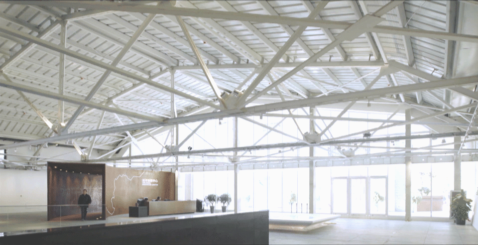 In such an ordinary factory building, when people are in the matrix of the roof trusses that are three meters high, they not only feel the strong industrial factory atmosphere, but also experience the order of the space brought by the repeated rhythm of the building structure. It's like entering a palace that pays attention to etiquette. The dark red of the stainless steel version that continues from the outdoors to the city appears calm and steady; while the white tensioned mesh for the maintenance finish outside the upper space is intertwined in the intricate roof trusses, giving it a hazy elegance. In the white space atmosphere dotted with some rust boards, the black grandstand sinking to the ground floor becomes the first spatial focus of the exhibition hall, and Zhang shows the power of space like a palace.