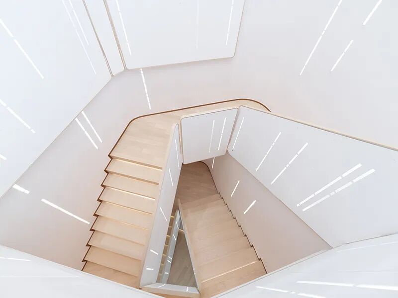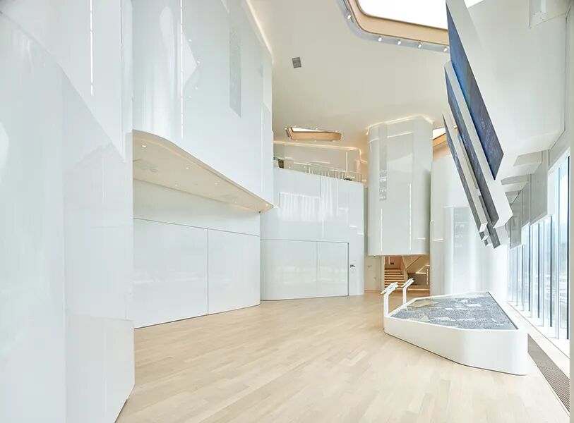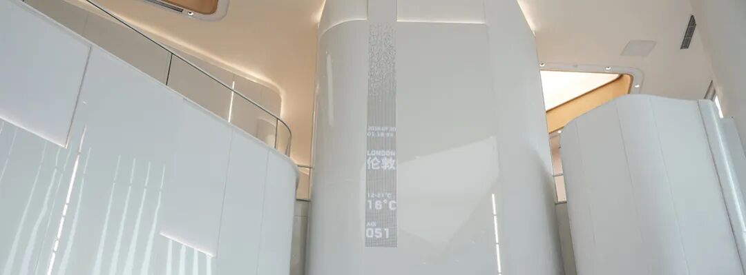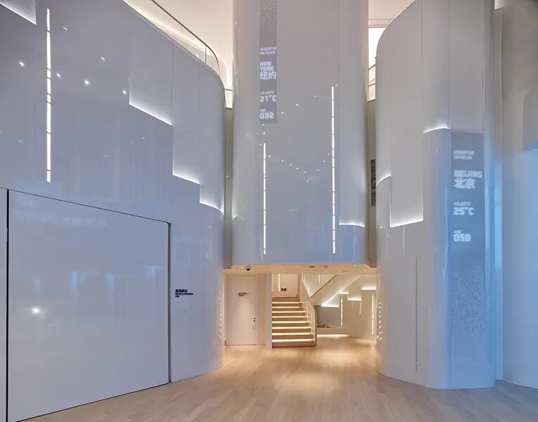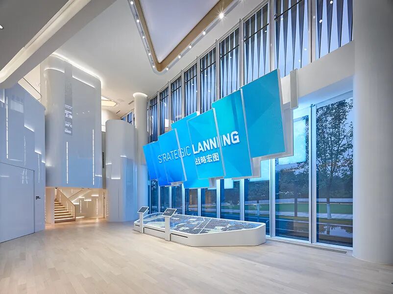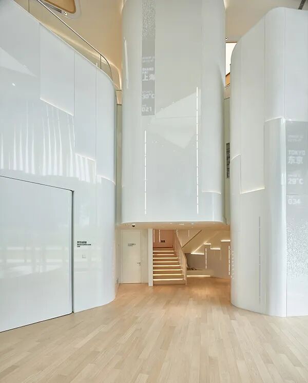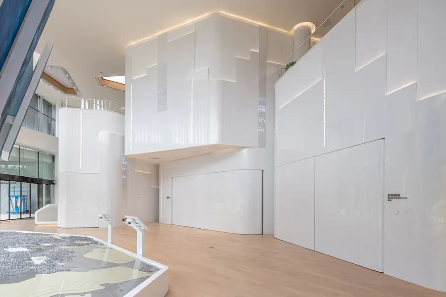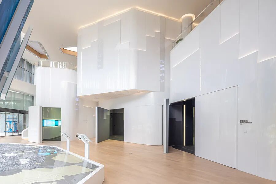 Pure white blocks are arranged in a circular pattern to form a tall indoor atrium, creating an open effect near the curtain wall and creating visual coherence between indoor and outdoor environments. Each white block is designed with a huge hidden door that can be opened and closed independently by the central control system. According to different reception needs and visitor positioning, the entire display center's movement line can form an open movement line or a closed single movement line.