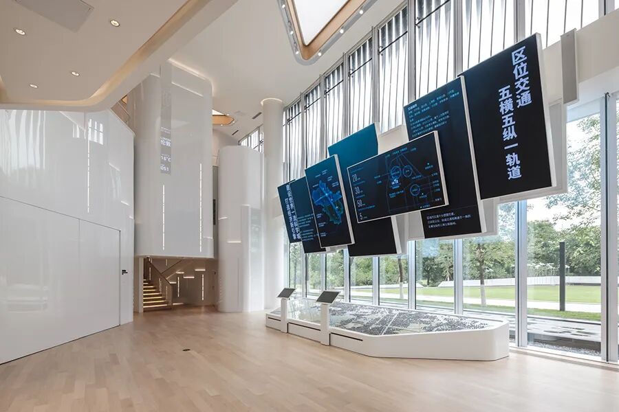 The interior space design takes "urban showcase" as the starting point, implanting three-dimensional white blocks into the exhibition hall building, and utilizing the internal space of each block to carry different sections of content. Try to preserve the tall and complete architectural spatial structure, and make the functional layout three-dimensional, forming a sense of hierarchy and staggered height similar to indoor buildings, and achieving a "city showcase" effect visible from outside the glass curtain wall.