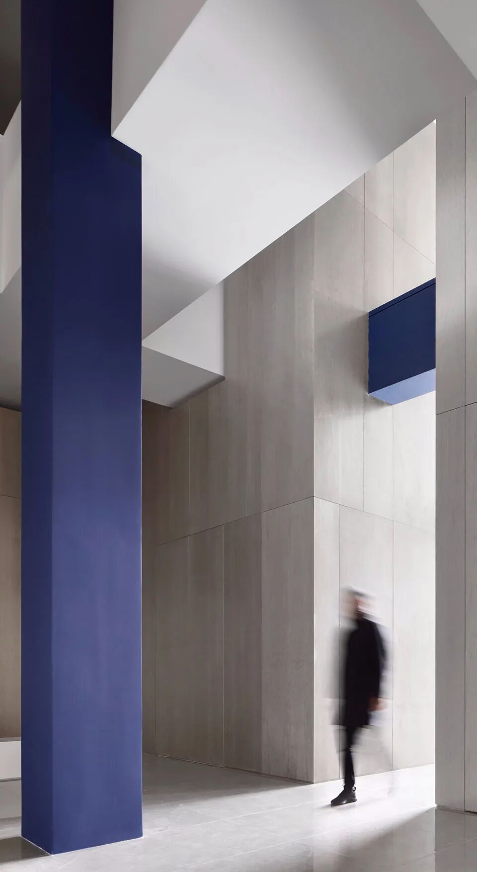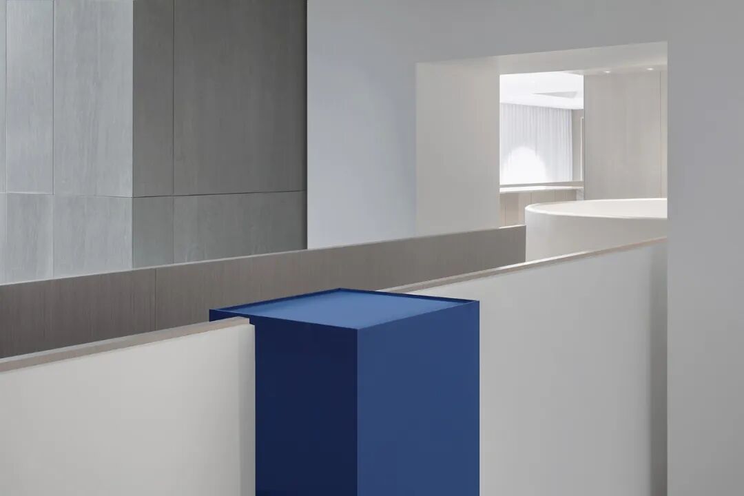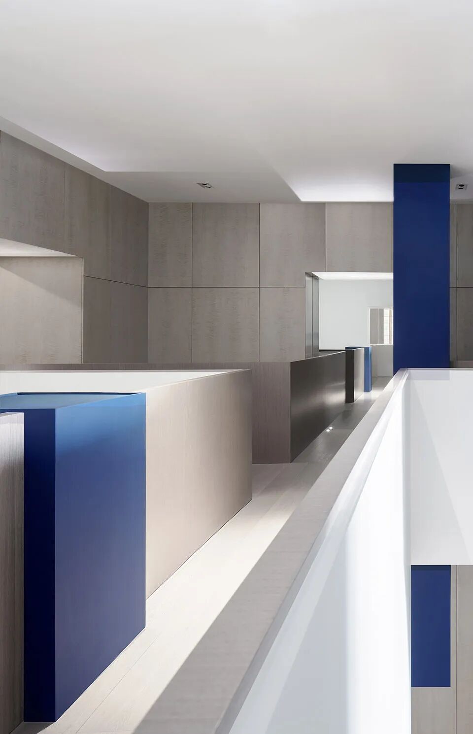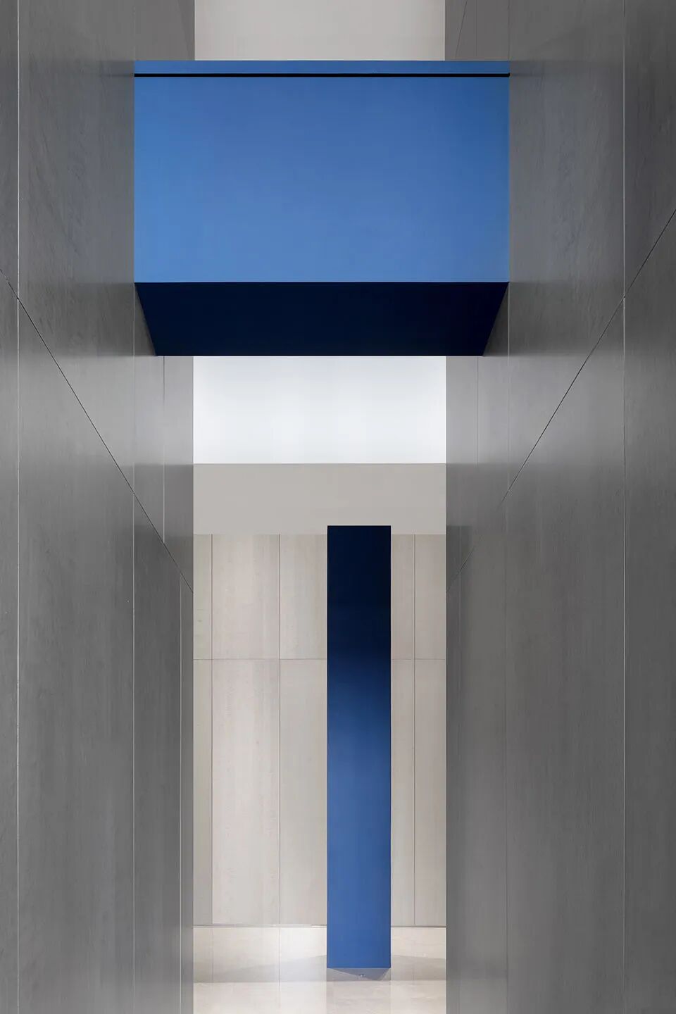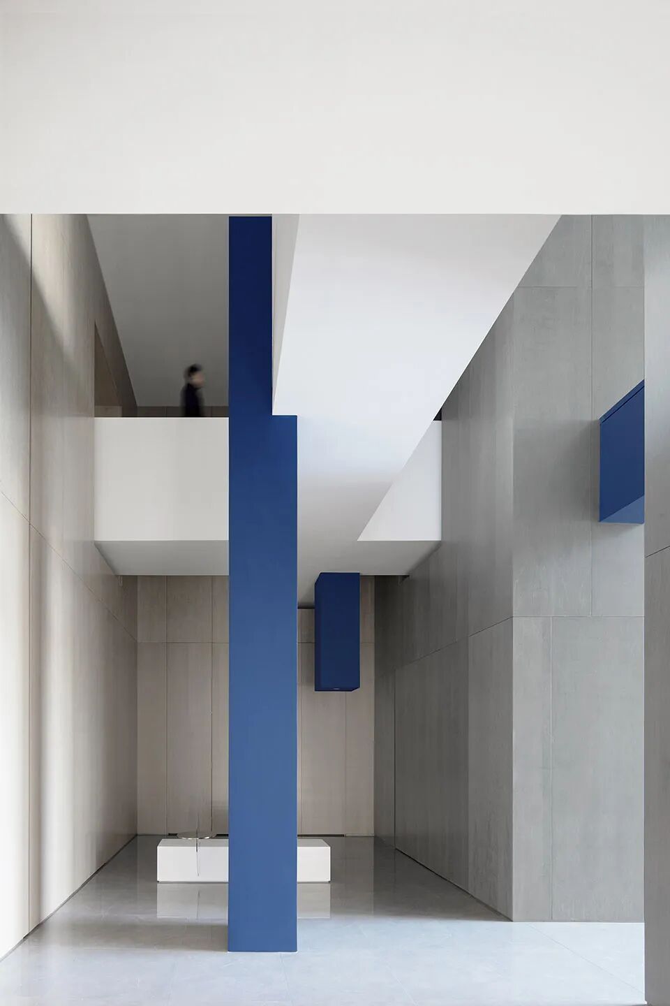 本,拆开有十, 它象征着空间的结构,纵横交错,犹如梅亚奇在发展过程中不断拓展的多维产品和架构,同时也是企业长期稳固的支柱。我们设计了蓝色的立柱和新建的廊桥,形成了十字型的交叉,巩固了空间的结构和氛围,同时明确了进入展厅之前的缓冲区。这两根蓝色立柱从地面升起,再由顶部下降,创造了垂直半空的结构,象征着断裂与新生,呼应了我们对空间气息的追求,体现了万物的平衡和理性至上的观念。