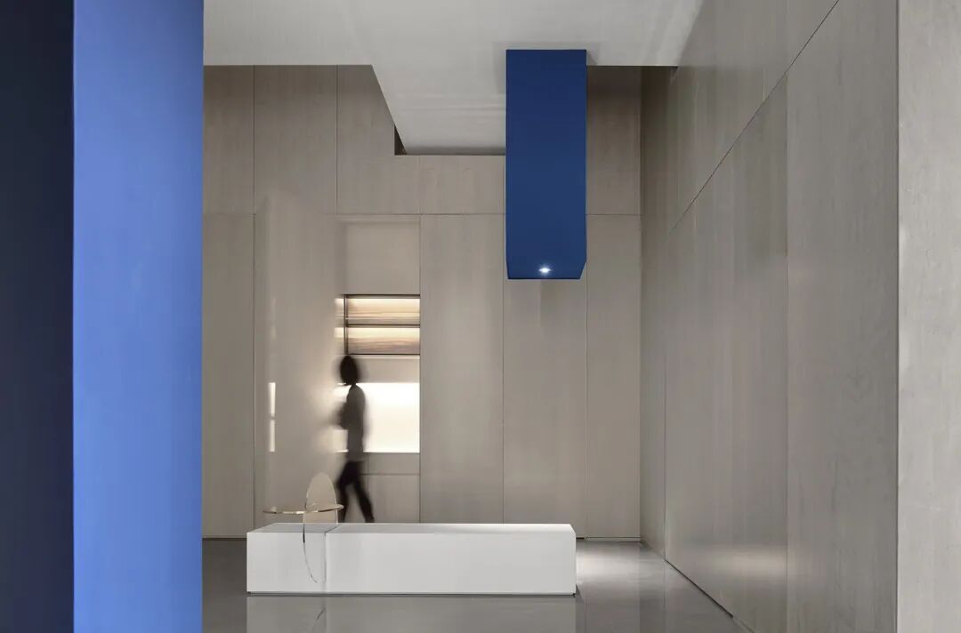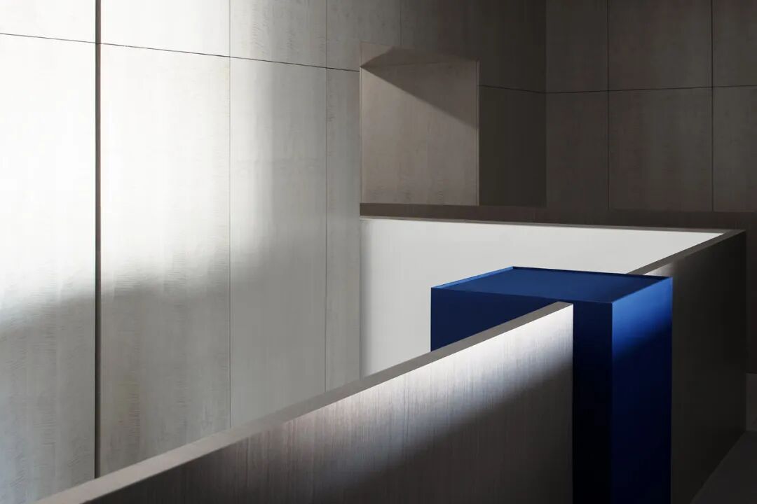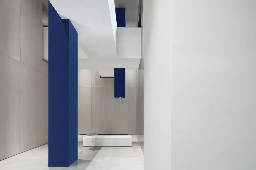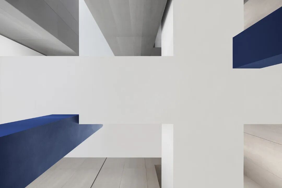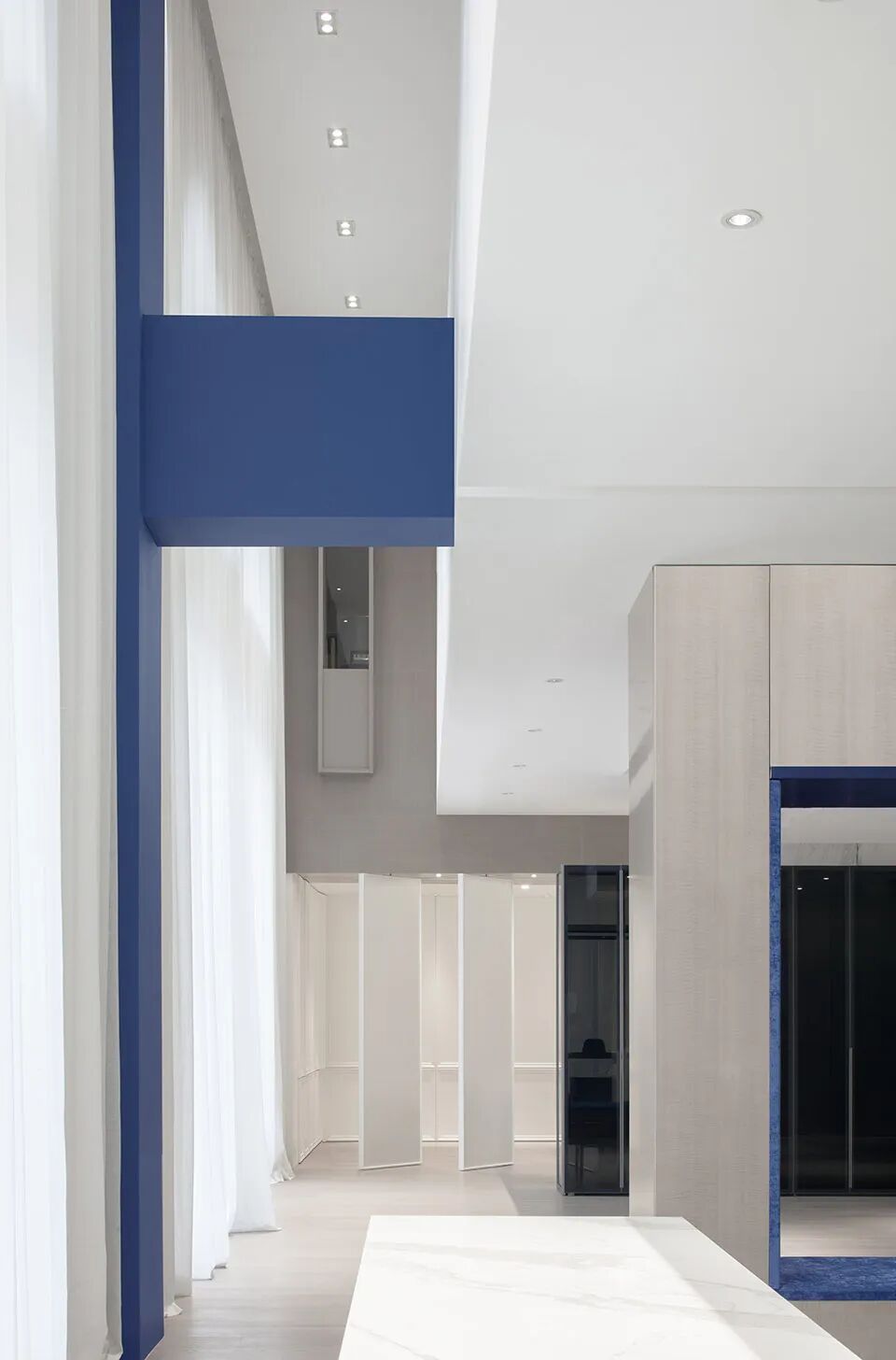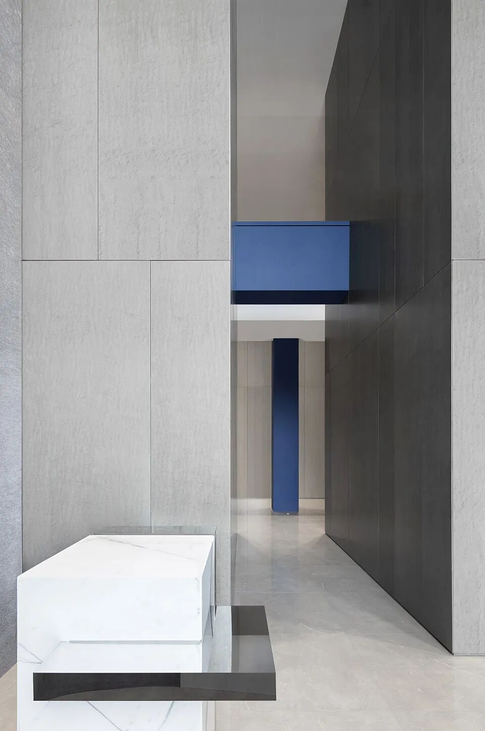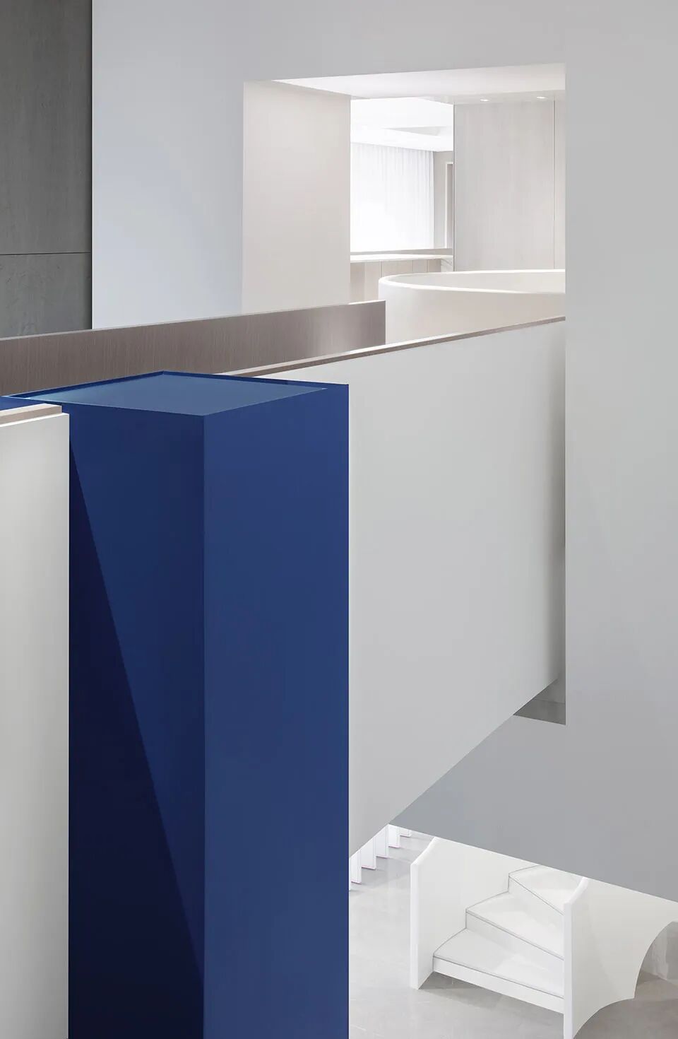 本,拆开有十, 它象征着空间的结构,纵横交错,犹如梅亚奇在发展过程中不断拓展的多维产品和架构,同时也是企业长期稳固的支柱。我们设计了蓝色的立柱和新建的廊桥,形成了十字型的交叉,巩固了空间的结构和氛围,同时明确了进入展厅之前的缓冲区。这两根蓝色立柱从地面升起,再由顶部下降,创造了垂直半空的结构,象征着断裂与新生,呼应了我们对空间气息的追求,体现了万物的平衡和理性至上的观念。