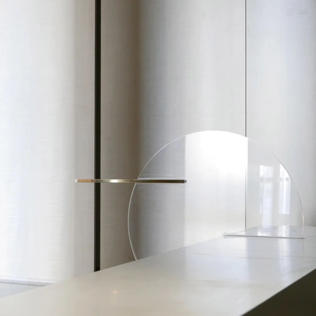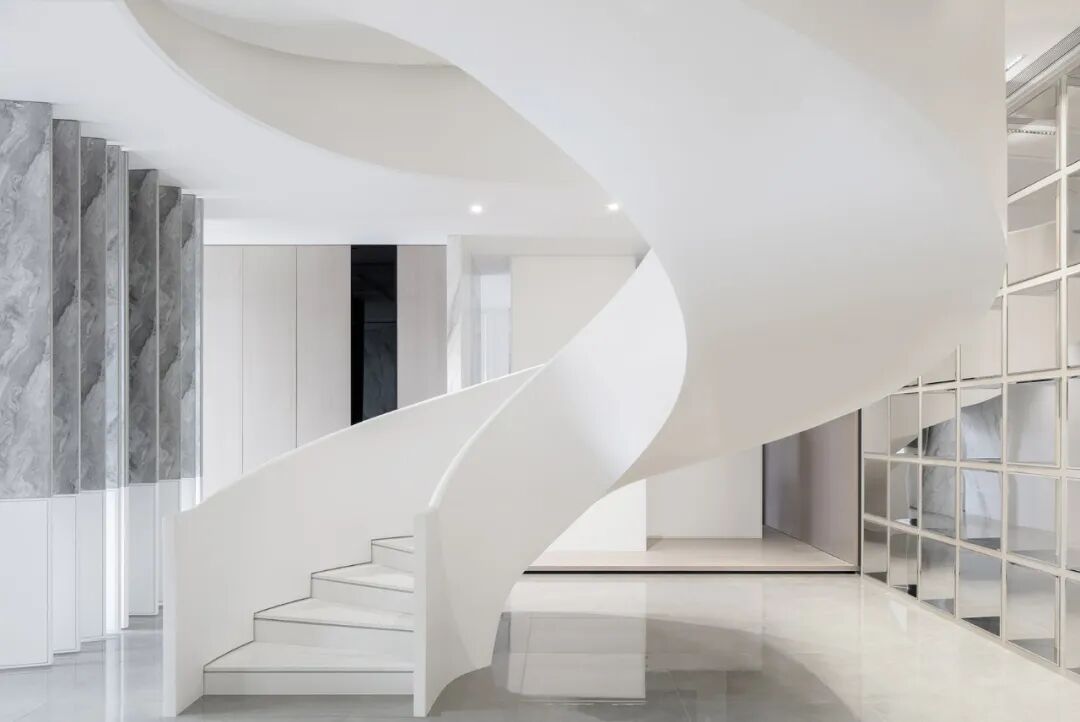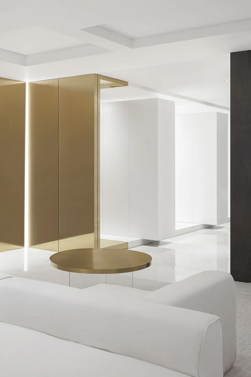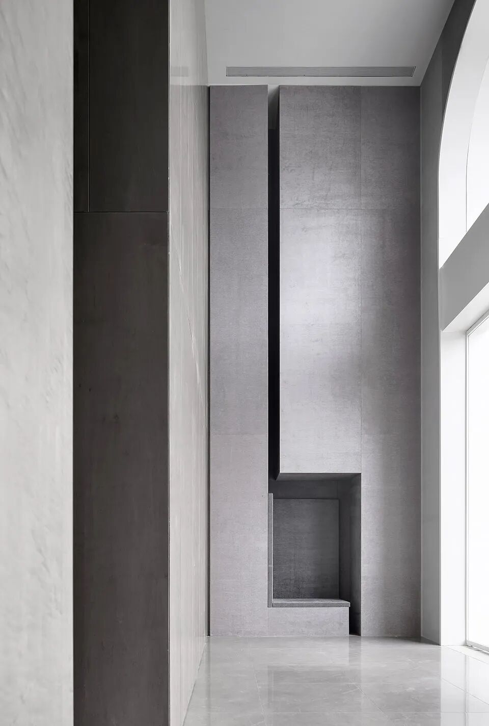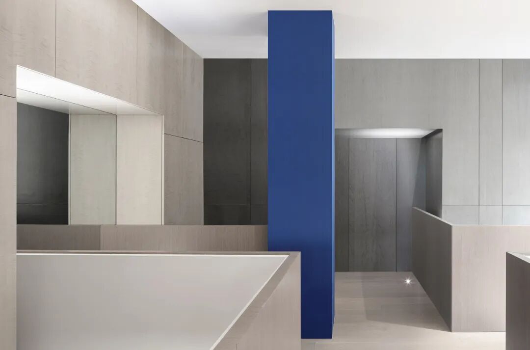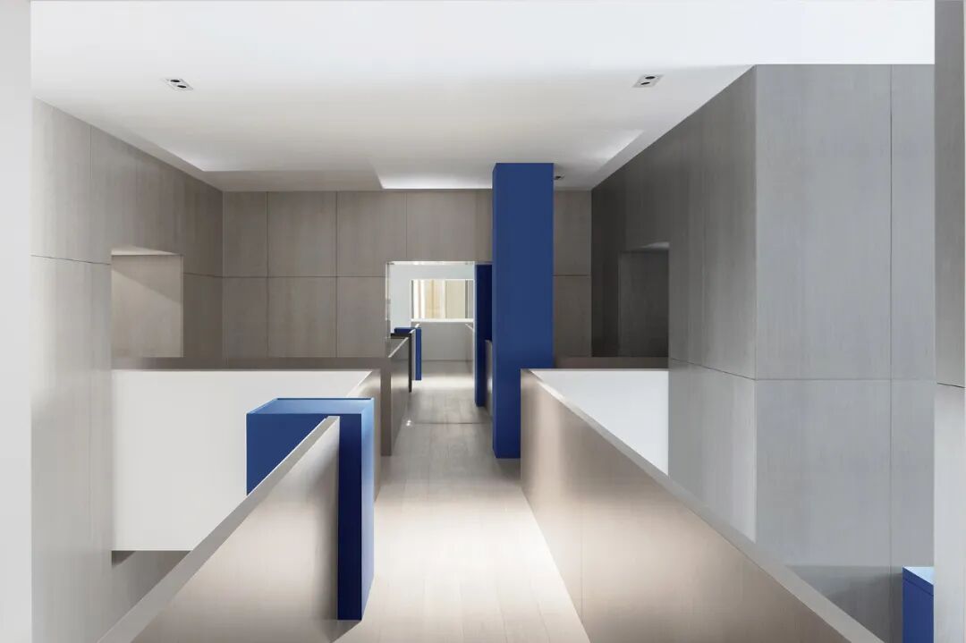 本,拆开有十, 它象征着空间的结构,纵横交错,犹如梅亚奇在发展过程中不断拓展的多维产品和架构,同时也是企业长期稳固的支柱。我们设计了蓝色的立柱和新建的廊桥,形成了十字型的交叉,巩固了空间的结构和氛围,同时明确了进入展厅之前的缓冲区。这两根蓝色立柱从地面升起,再由顶部下降,创造了垂直半空的结构,象征着断裂与新生,呼应了我们对空间气息的追求,体现了万物的平衡和理性至上的观念。
