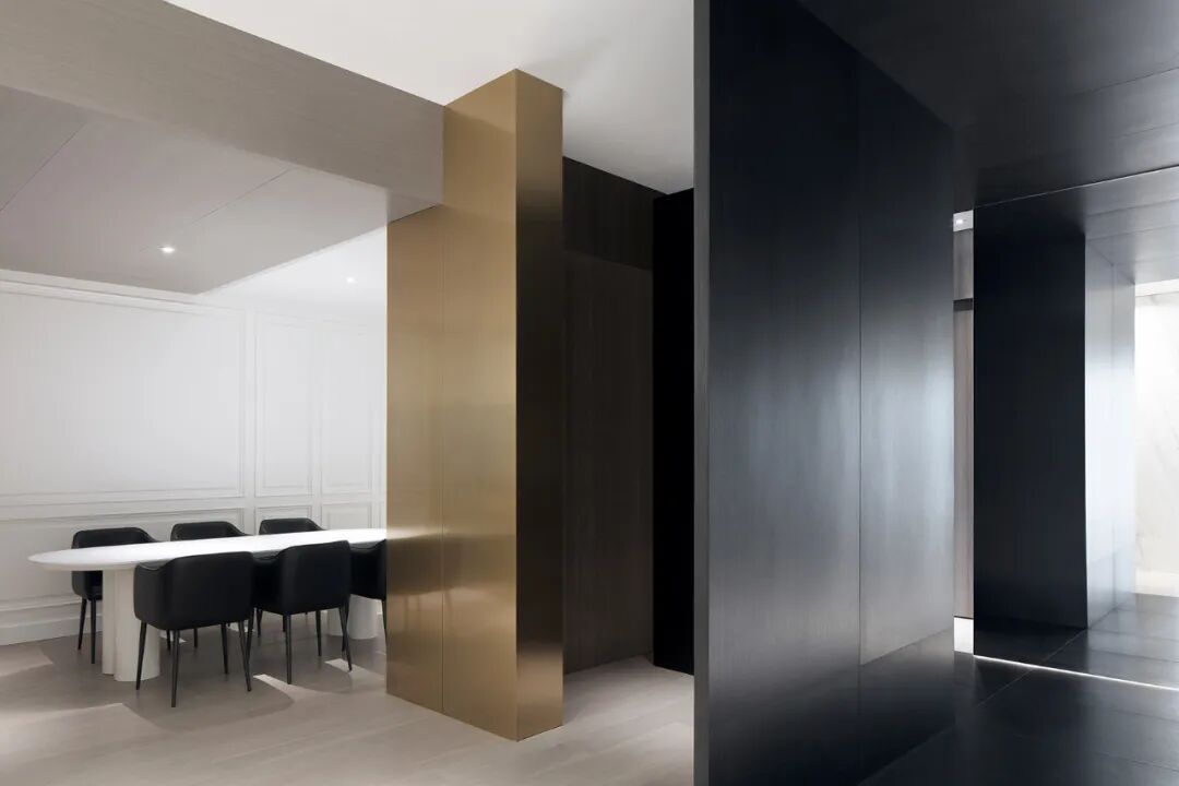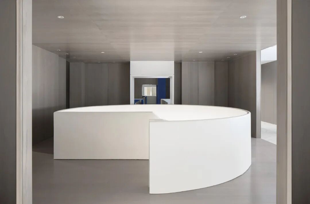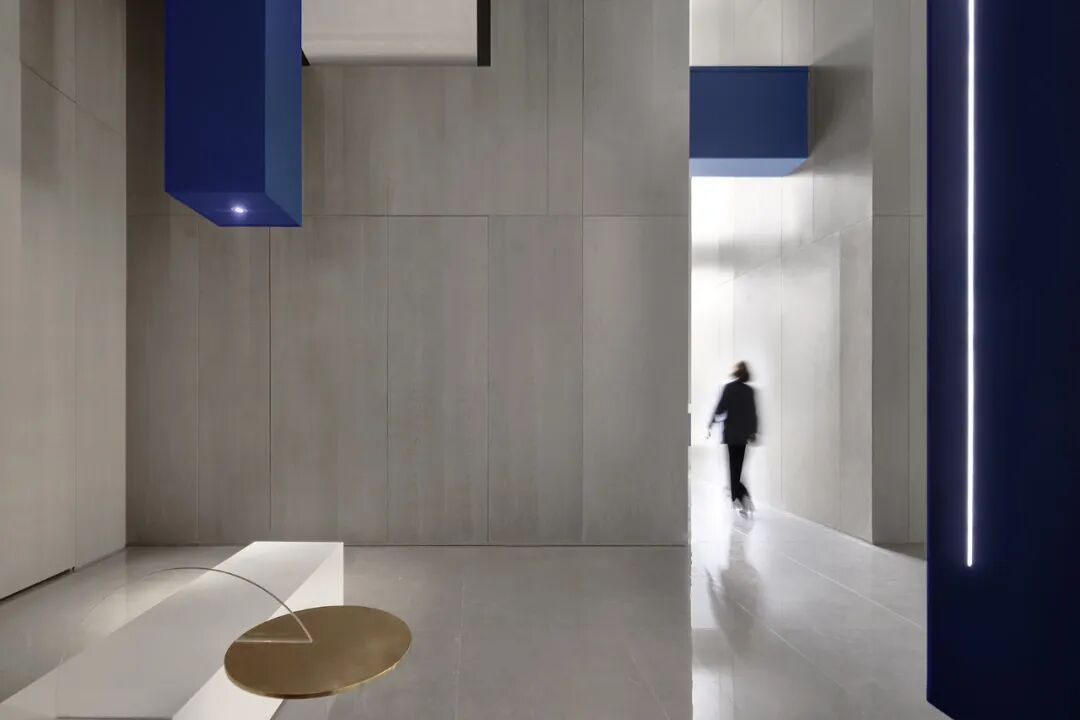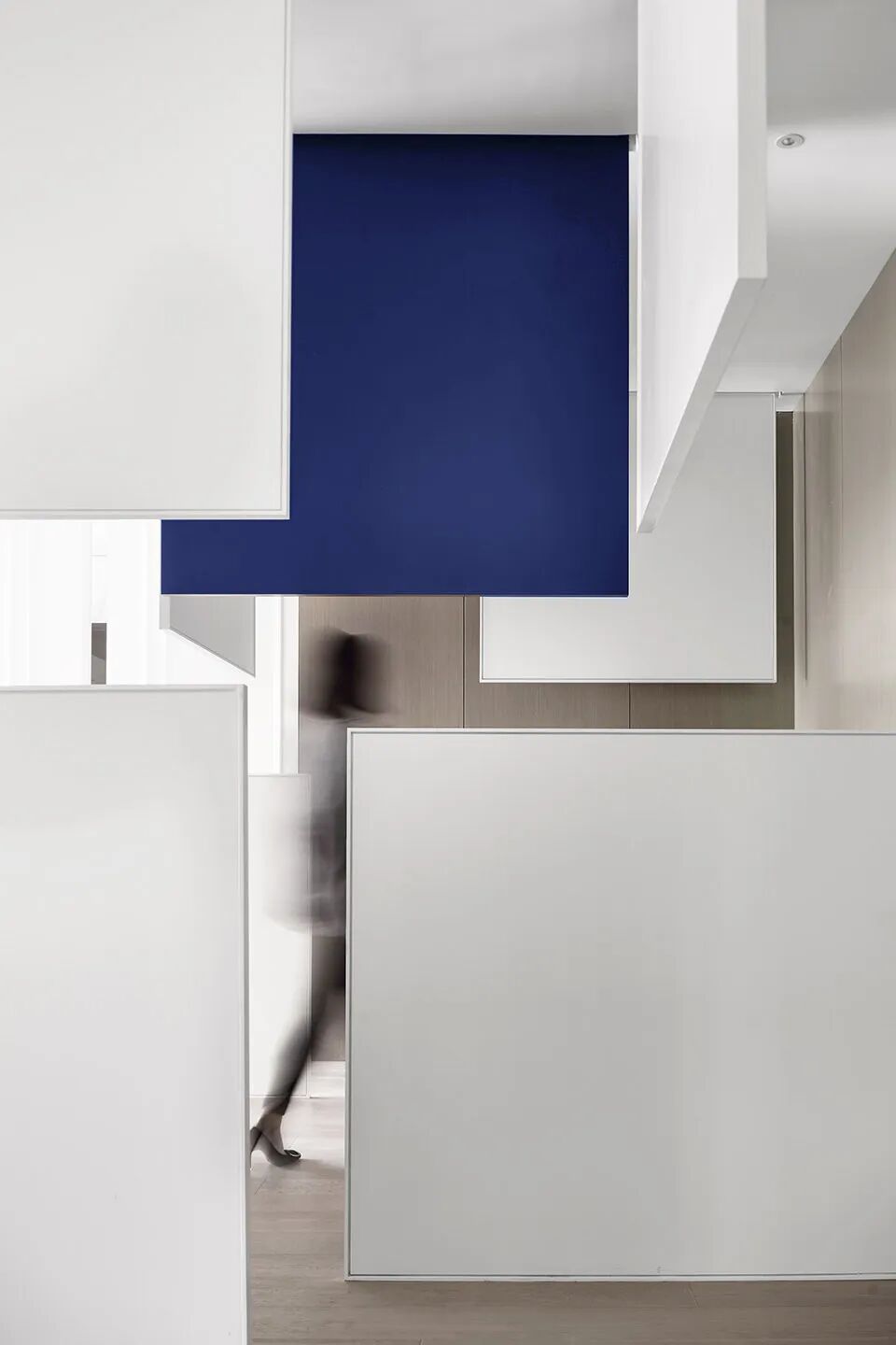 本,拆开是一 。一代表着始终如一、独一无二、平衡,它是空间设计中最基本的支柱,是剥开“本”字后最核心的立柱。以线构建面,形成了丰富多样的可能性,使蓝色体块与空间互动连续而反复。对于甲方而言,“一”代表着他们专注于设计执行的精神,也象征着无限延续的未来发展。将这些立意点以空间结构、尺度和色彩的形式展现出来,结合功能性的区域划分,最终呈现了这样一个空间。