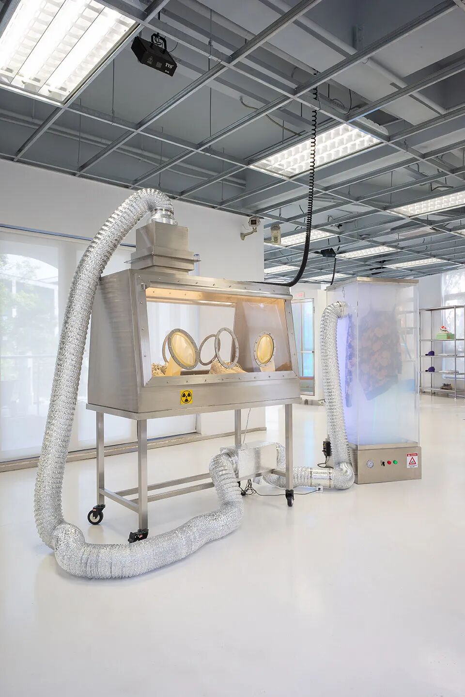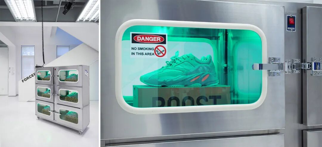 进门第一个艺术装置——“能量提取”,颇具科技感的金属外壳中,暖黄色灯光照射着最新的潮流单品。借助银色管道“提取”能量后,旁边的透明盒中就会释放出烟雾,传递一种能量的融合和增强。