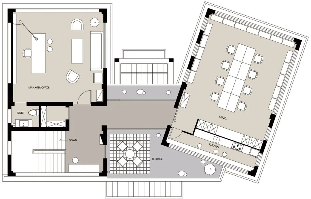 作为潮流品牌集合店,THE MIX LAND 一目了然的空间动线,自由移动的陈列装置,以街头的名义提供一种更加多元化、兼具商业和体验双重功能的选择。除了店铺空间之外,极简白色和金属元素也延伸到了二楼的办公环境中,相对留白的空间里选用 Vitra、Avarte 和 Flos 等家具品牌的经典款式作为点睛之笔,点缀带有街头风格的鲜艳色彩插画,呈现一个与店铺呼应,明亮自由的办公空间。