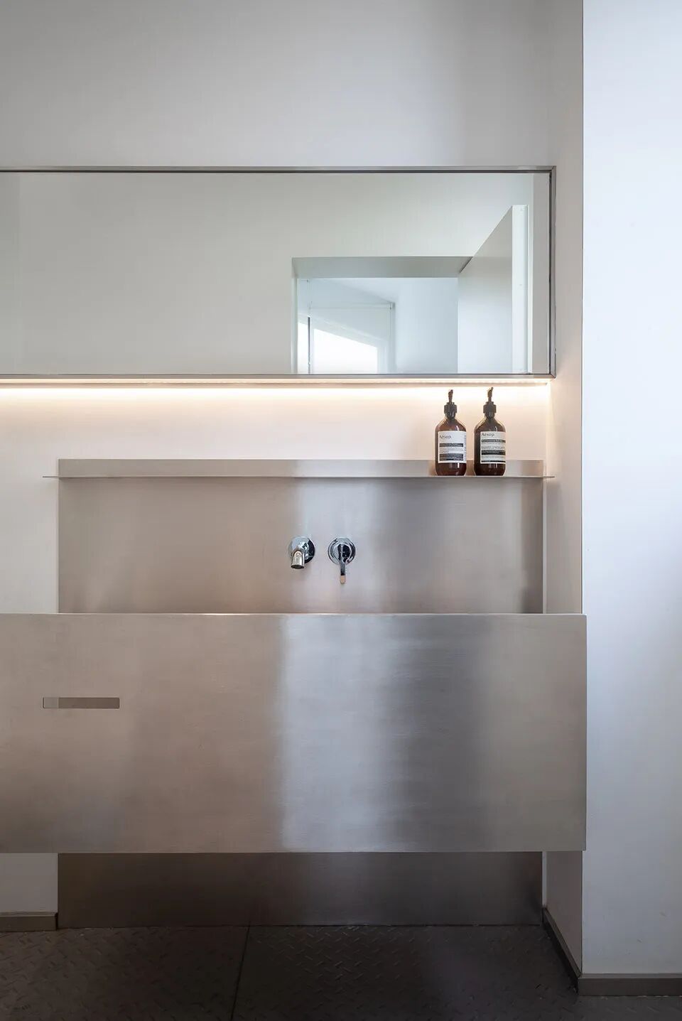 延续实验室的概念,空间顶部保留了具有工业感的不锈钢元素和明亮的格栅灯。陈列货架、艺术装置、试衣镜和装饰部分都选择了同样的金属材质。