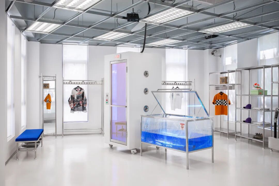 能随意移动的试衣间设计灵感来自于实验室中用作消毒的风淋室。包括楼梯旁的展示鞋柜,如同消毒箱一般,代表着街头元素在设计中的“自由”感。