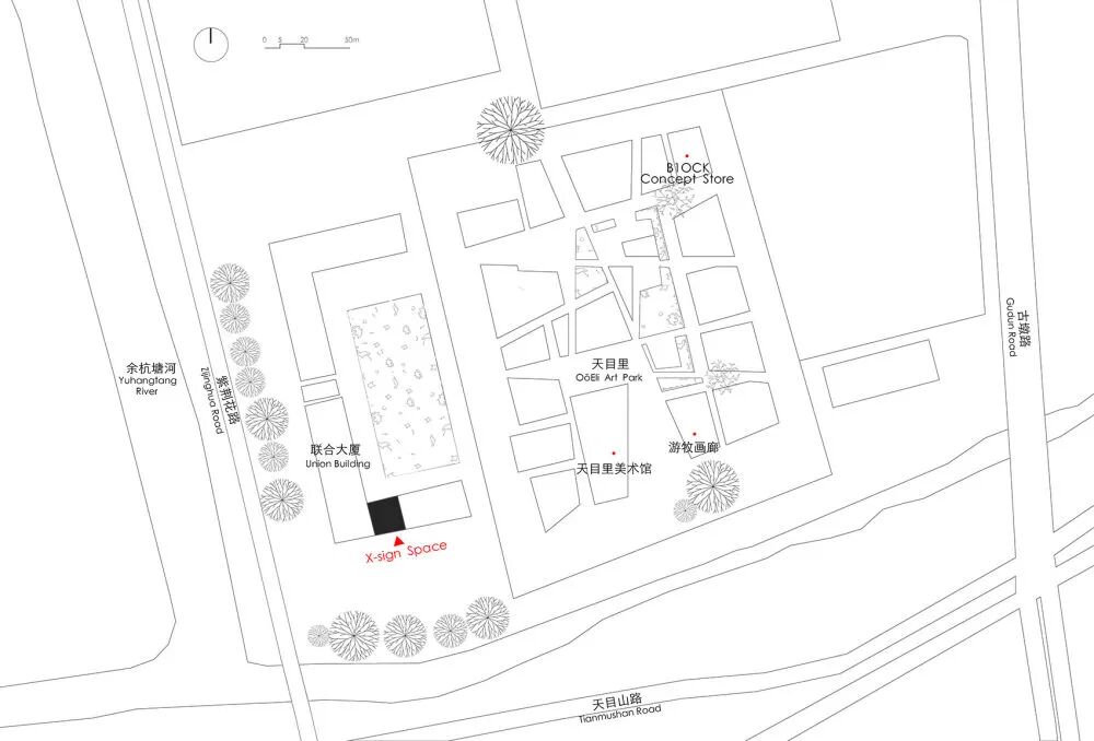 The project is located in Block A of United Building next to Hangzhou Tianmuli. The block includes Tianmuli Art Museum, Nomad Gallery, B1OCK Fashion Buyer Store, etc. It is a commercial and cultural vitality block open to the public. And X sign Space complements its existing main positioning of contemporary art.
