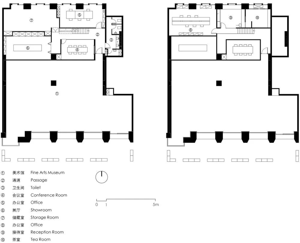 In order to maximize the area of the exhibition area, we use the floor height to plan a practical and compact two-story functional space, and use a narrow double-height core to solve the entrance and traffic problems between all functions, forming an L-shaped "core tube".