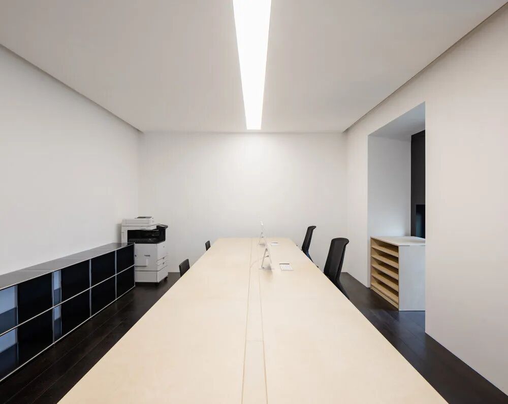 墙面阴阳角均嵌入铝条收口,使空间呈现精确的直线。面使用了德国panDOMO磐多魔工艺,混凝土与水泥组合的成分呈现自然浅灰,并提供更优的耐磨性与防滑度。墙顶面使用了美国BenjaminMoore涂料,一款高环保标准的百年产品,并由专门工匠师傅进行粉刷;白墙看起来几乎完全平滑,实则略有不规则磨砂肌理,轻柔地反映自然光线,形成精致的阴影。内配置专业展馆照明系统,由Artemide灯光提供。