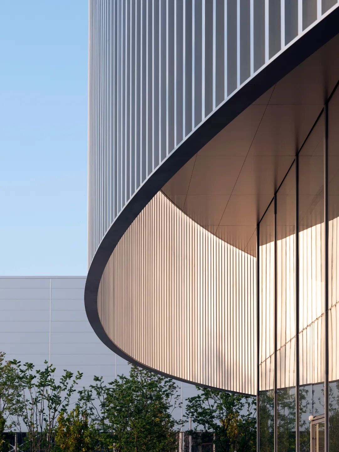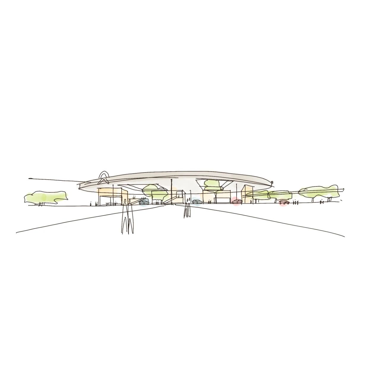 合肥新桥牛屋毗邻合肥机场,坐落于新桥智能电动汽车产业园区主入口轴线上。圆形开放的体量使它从周围密闭的工业建筑群中脱颖而出,相近的尺度又令它与邻近的建筑和谐共存。