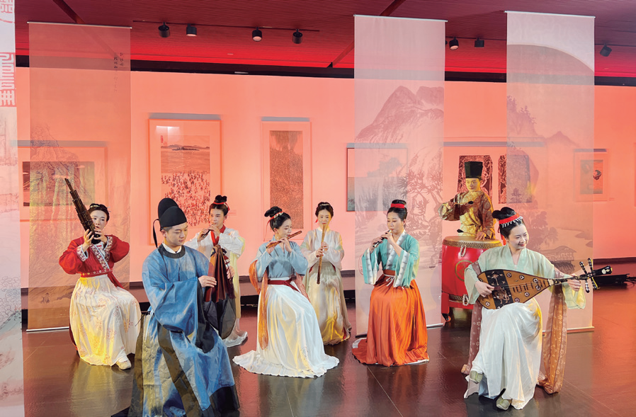 图12 中央民族乐团演奏者们在展览现场演奏《夜宴》