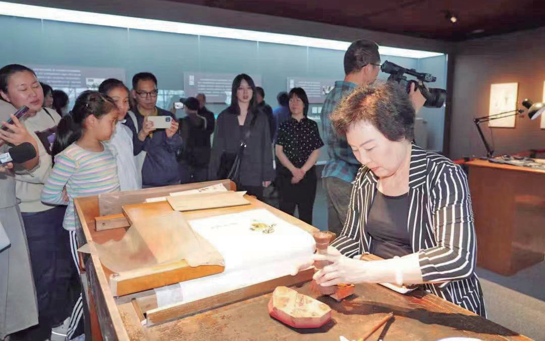 在本次展览中,策展团队在展厅空间内专门设 计了木版水印工作坊的场景还原,非遗传承人在展 期内不定期向观众展示“印制”环节的技艺;同时 还策划举办了“非遗活动周”,邀请社会观众免费 来大剧院现场体验木版水印的印制过程,在非遗传 承人的讲解与指导下,观众可以更加直观地参与和 体验到木版水印的印制乐趣,从而使这项非物质文 化遗产真正地“活”起来(图11)。
