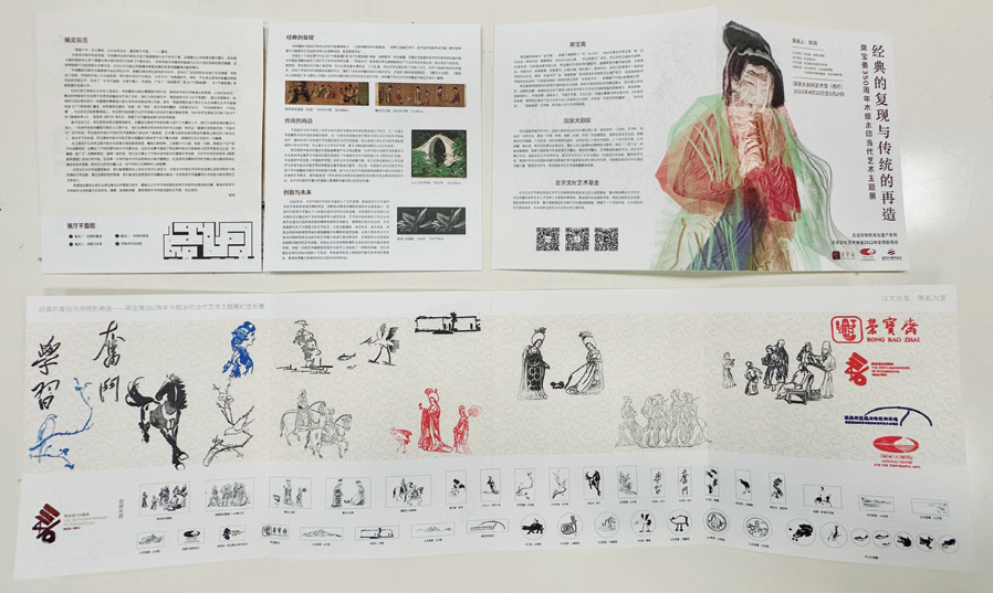 展厅入口作为吸引观众前来参观的重要宣传地 点,在主视觉处选取《韩熙载夜宴图》中“击鼓” 的部分作为基本图像,将画中人物抠图放大至真人 等大,制作出PVC人牌固定于主视觉墙面上,起到 凸起有层次的视觉效果(图7);展厅外海报及折页 封面选择以木版水印技艺刻印而成的“吹箫仕女” 图样(图8),点明展览以“荣宝斋350周年木版水 印当代艺术主题展”的核心主旨。