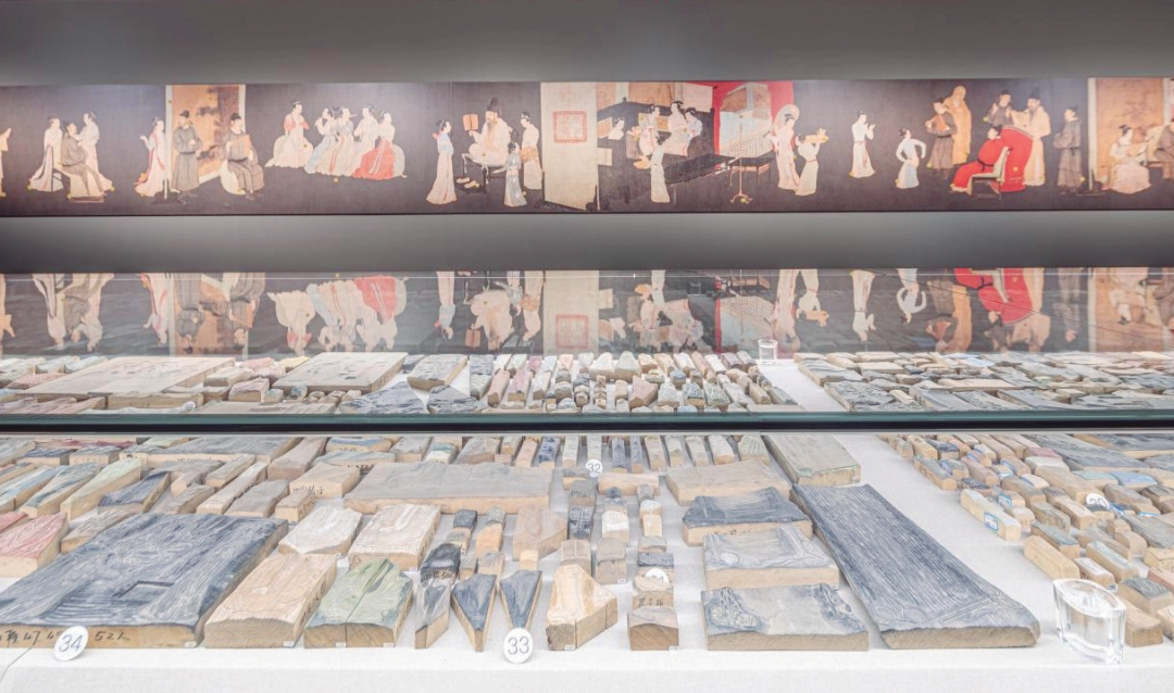 “经典的复现”作为第一部分,也是本次展览的重中之重。该部分以多元化展品向观众多维度展示了荣宝斋的木版水印技艺,其中包括:通过展出不同时期荣宝斋木版水印的代表作品,体现出荣宝斋精湛的复制技艺和在复制技术上的不断突破;以图文及视频宣传片的方式梳理荣宝斋历史发展沿革;对木版水印制作工具实物的展示和将“勾描、刻版、印刷、装裱”四个环节进行图文和场景还原展示。更值得一提的是,作为荣宝斋镇馆之宝的绢本木版水印《韩熙载夜宴图》(图1)不仅在本次展览中得以展出,荣宝斋非遗研究院更是将1667块原版悉数提供给策展团队,通过展览使尘封了40余年的木版重见天日,首次全面亮相在观众面前。