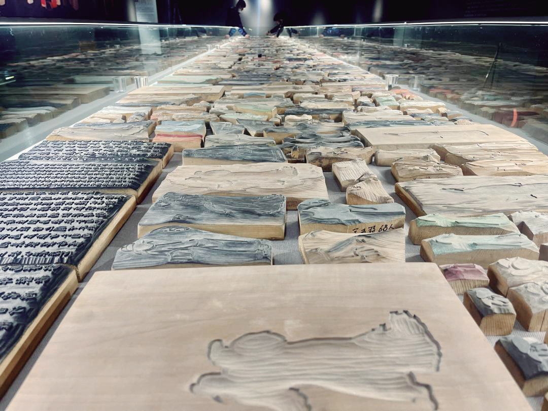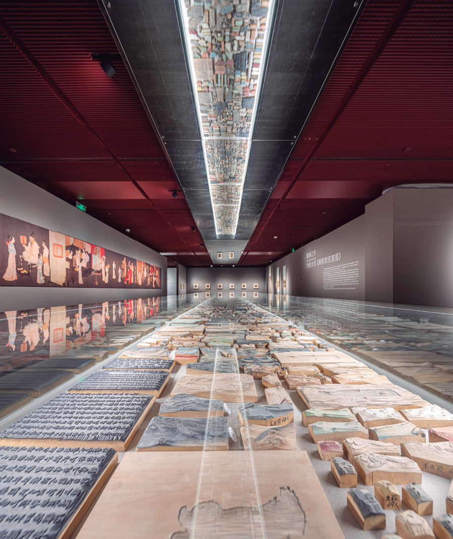 图10 展柜上方安装14米长玻璃镜面,将展柜内木版反射到镜 面中,视觉效果震撼