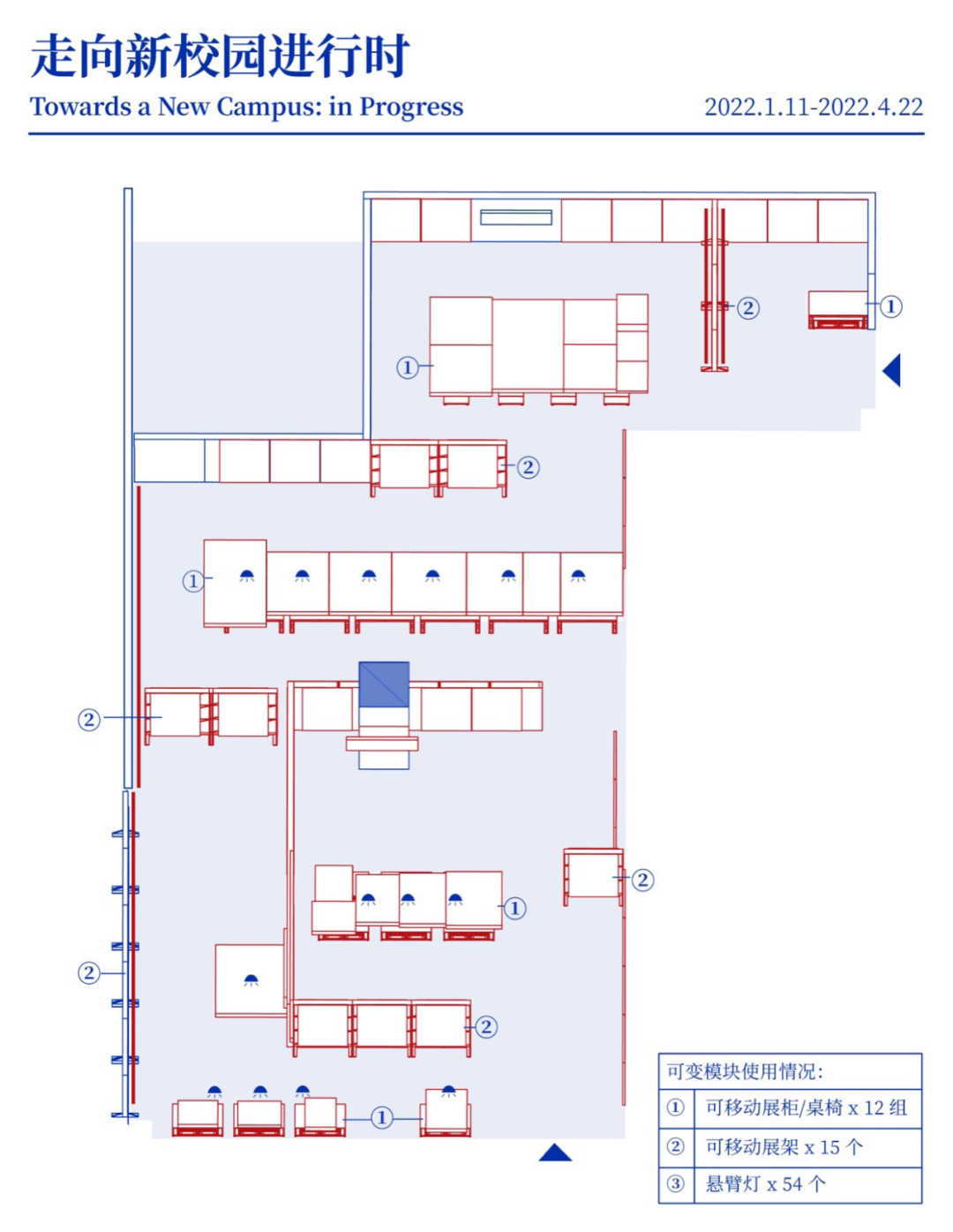 这次展览是一期高密度校园的作品与内容展示,对于有限的空间场地来说也十分具有挑战性,同时兼具布展时间极短的考验。通过连续的展架延伸成展墙,可移动桌椅形成长展桌,展览得以拉长观展流线,增加展示面积,使作品同样得到高密度的呈现。